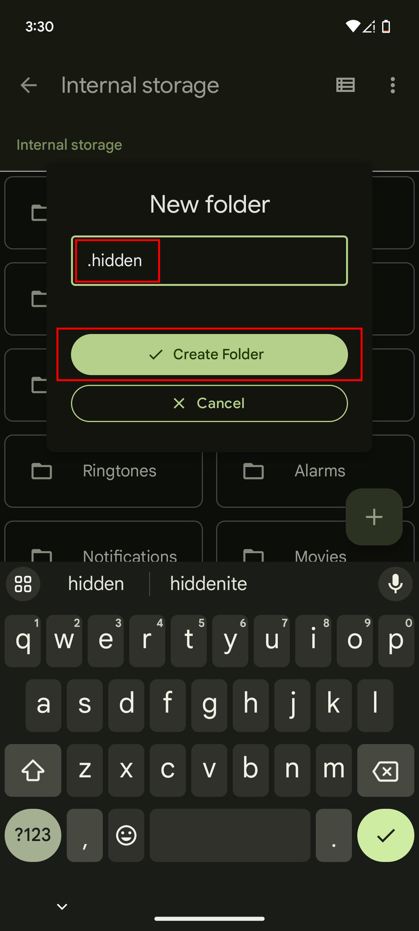 - Make sure the folder name starts with a period. For example: .hidden. The name could be anything; just ensure it starts with the period.