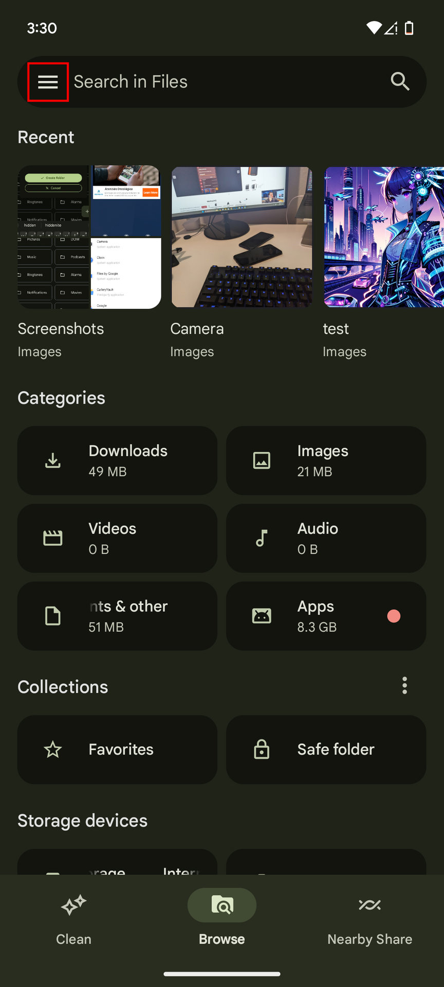 - You won’t be able to see the folder by default. To see it, navigate back to the Files homepage and tap on the three-line menu button in the top-right corner. Go to Settings and toggle on Show hidden files.