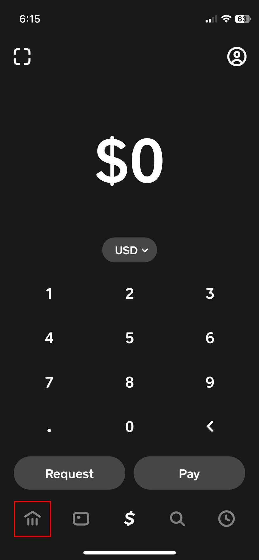 - Tap on the Money tab. It looks like a bank building, or your balance, if you have any.