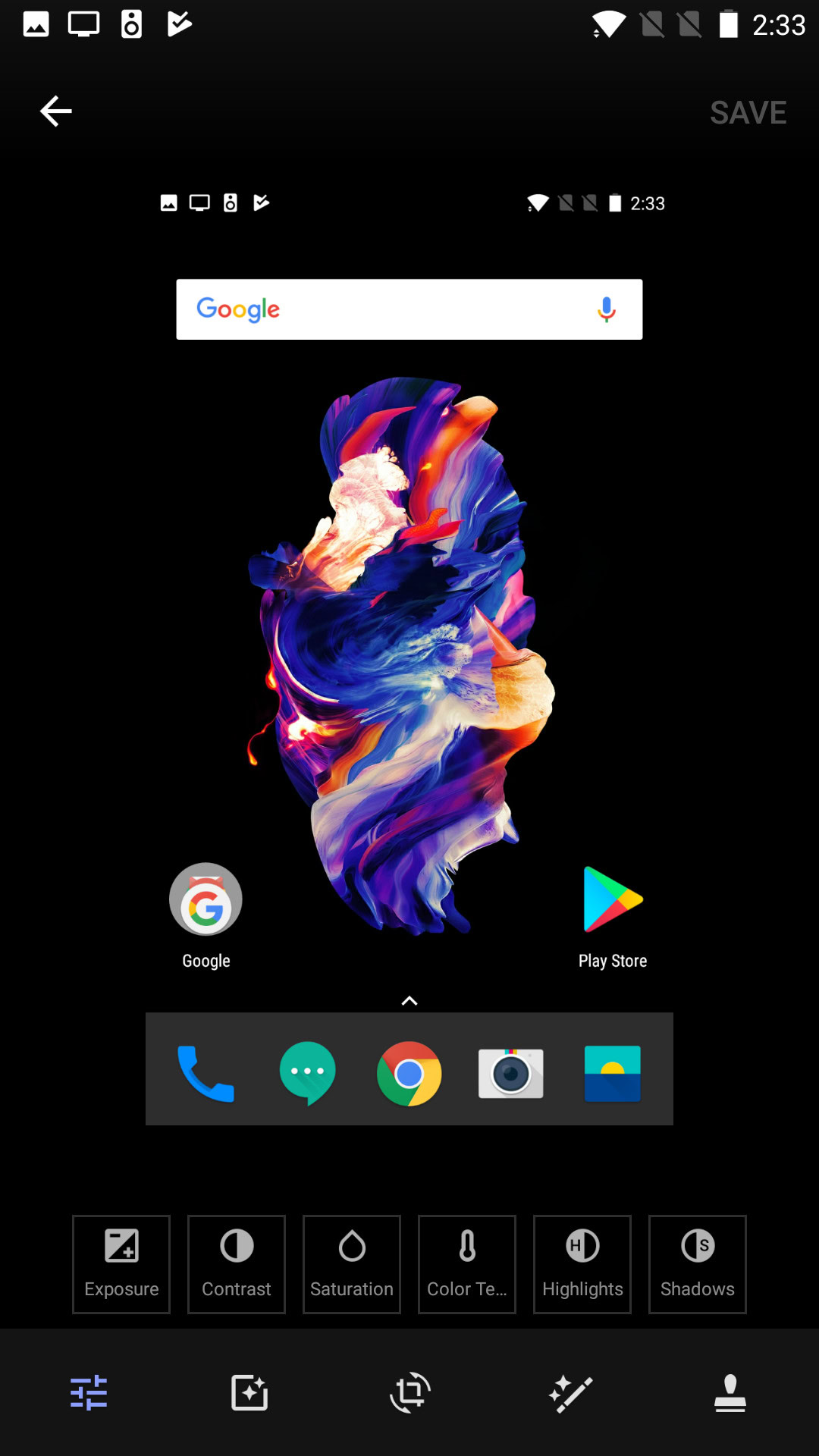 The first set of editing tools represent individual color aspects of the image, and include exposure, contrast, saturation, color temperature, highlights, and shadows. These each have individual sliders which you can use to tune your image how you like, and can save it once you get the settings you want.