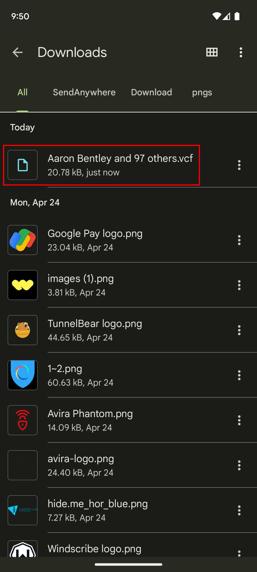 - Click the Share icon in the top-right corner and select Export vCard. When the .vcf file downloads, you can import that file to your Google Contacts or straight to your phone.