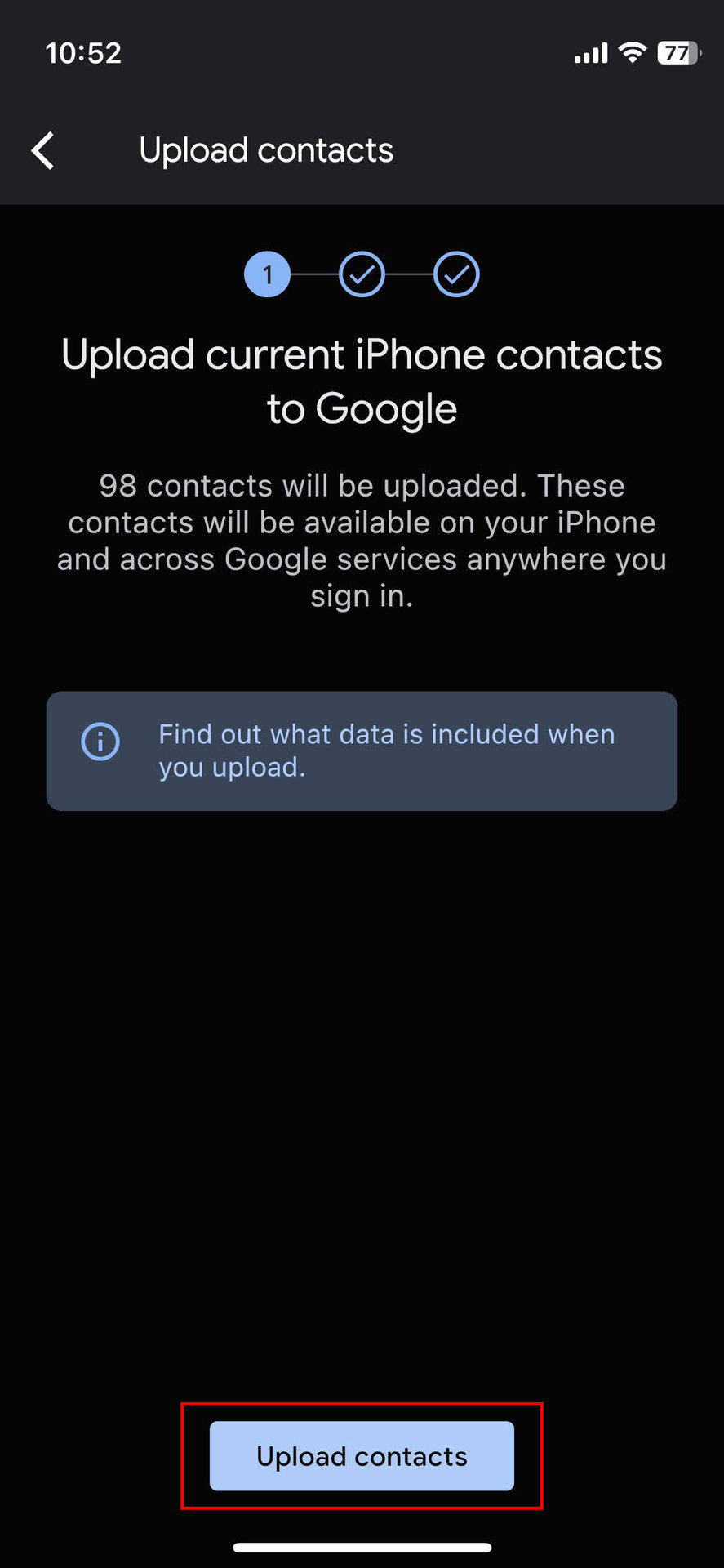 - Now, contacts will automatically sync from your iPhone to Google Contacts. In turn, they will also sync to your Android device, as long as you’re using the same Google account.