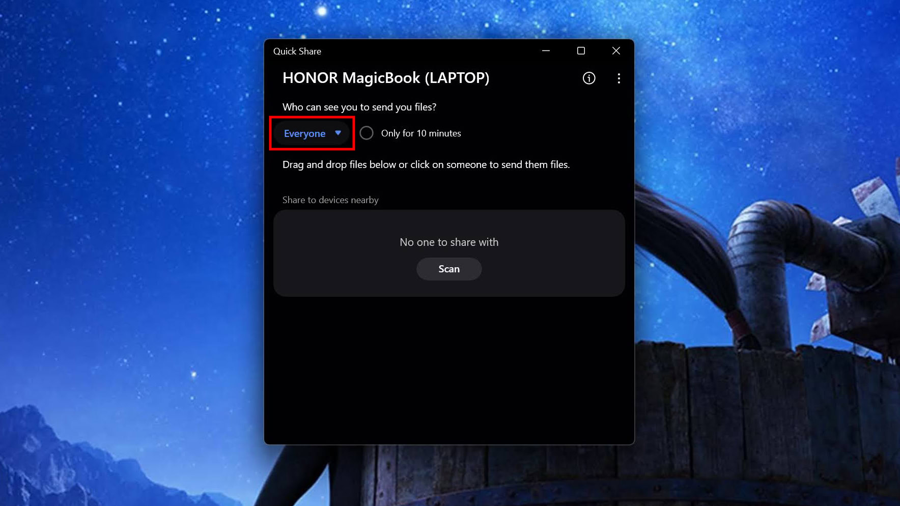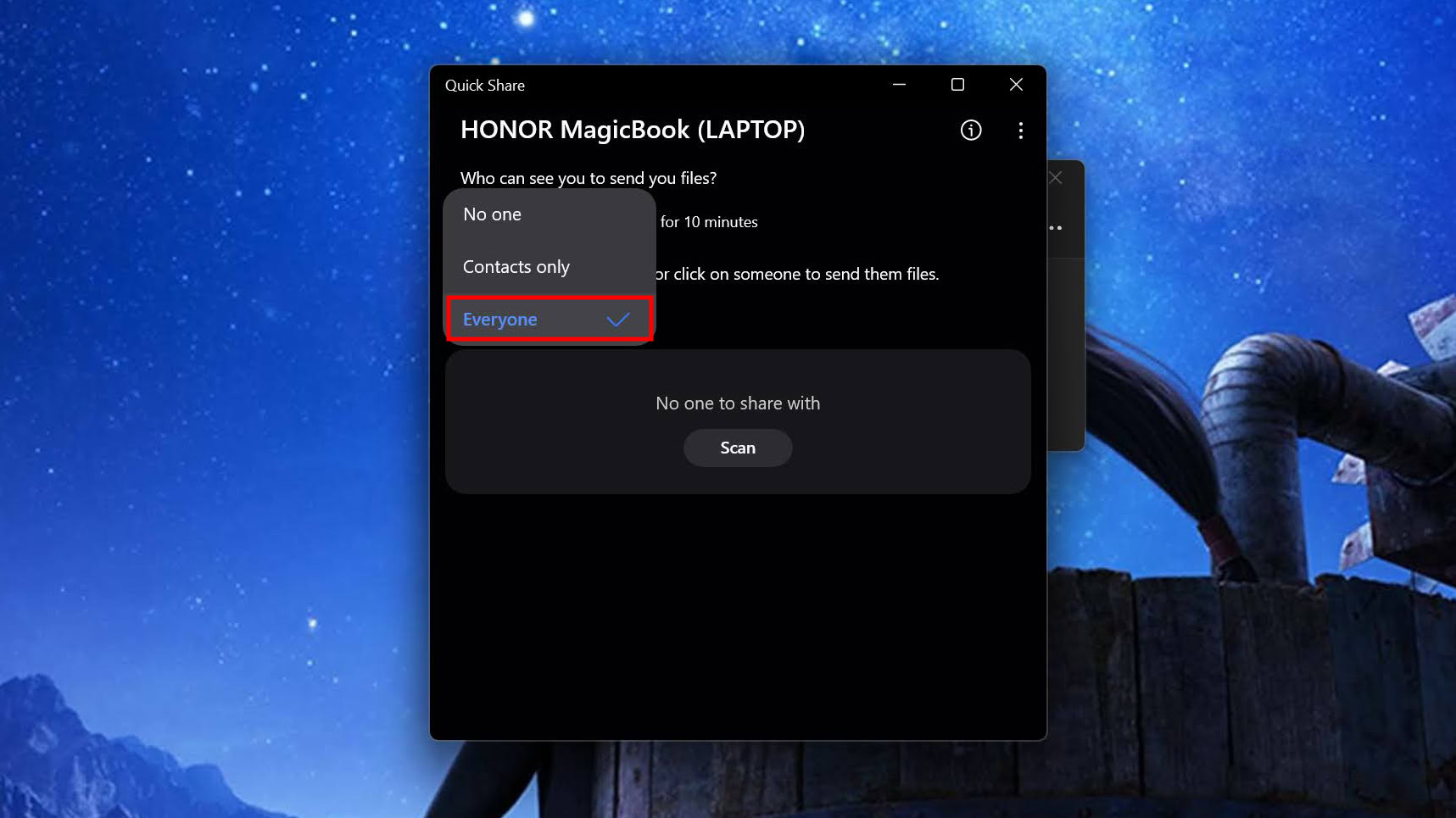 - Select Everyone. By default, your computer is only discoverable for 10 minutes.
