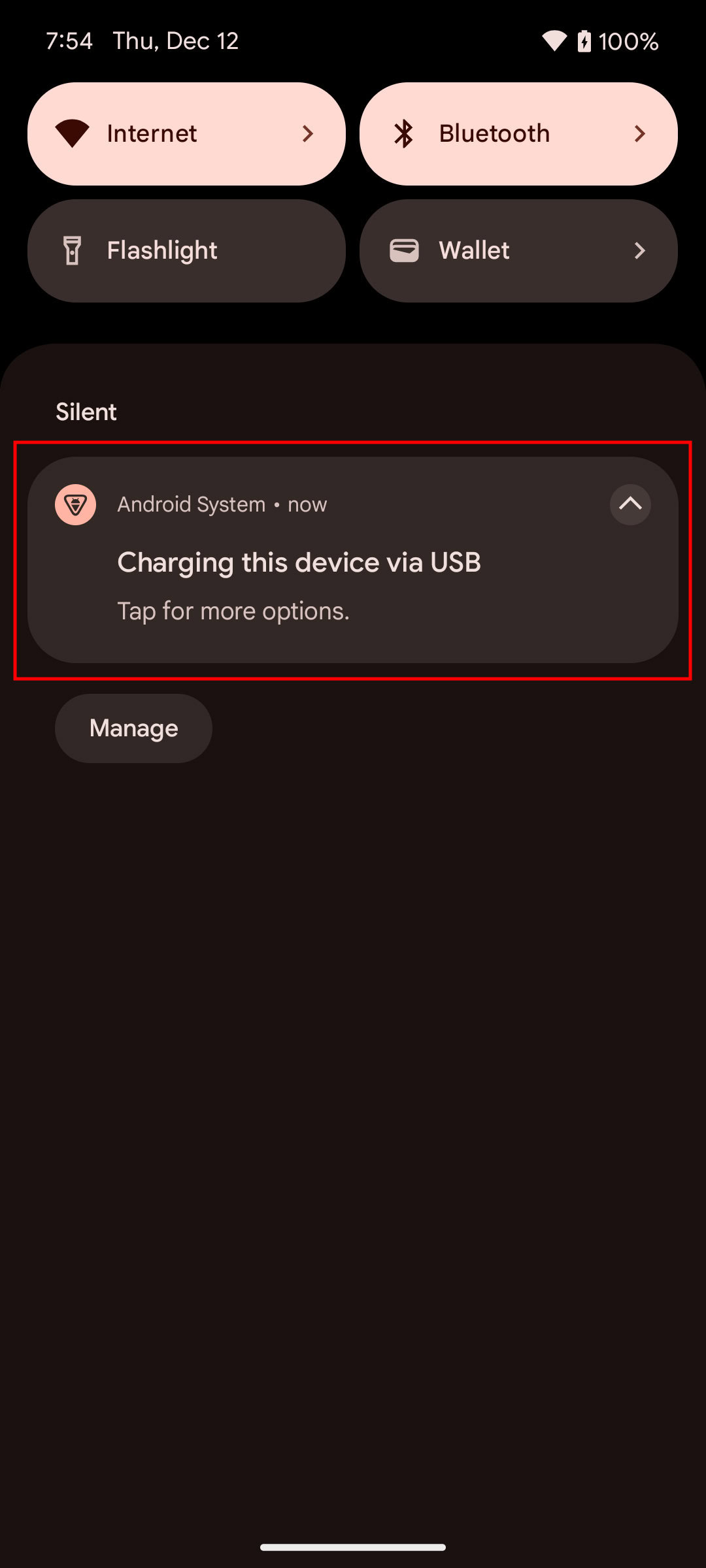 - You will get a notification on your Android phone, reading “Charging this device via USB”. Expand this notification by tapping on it. Then tap on it again to open more options.