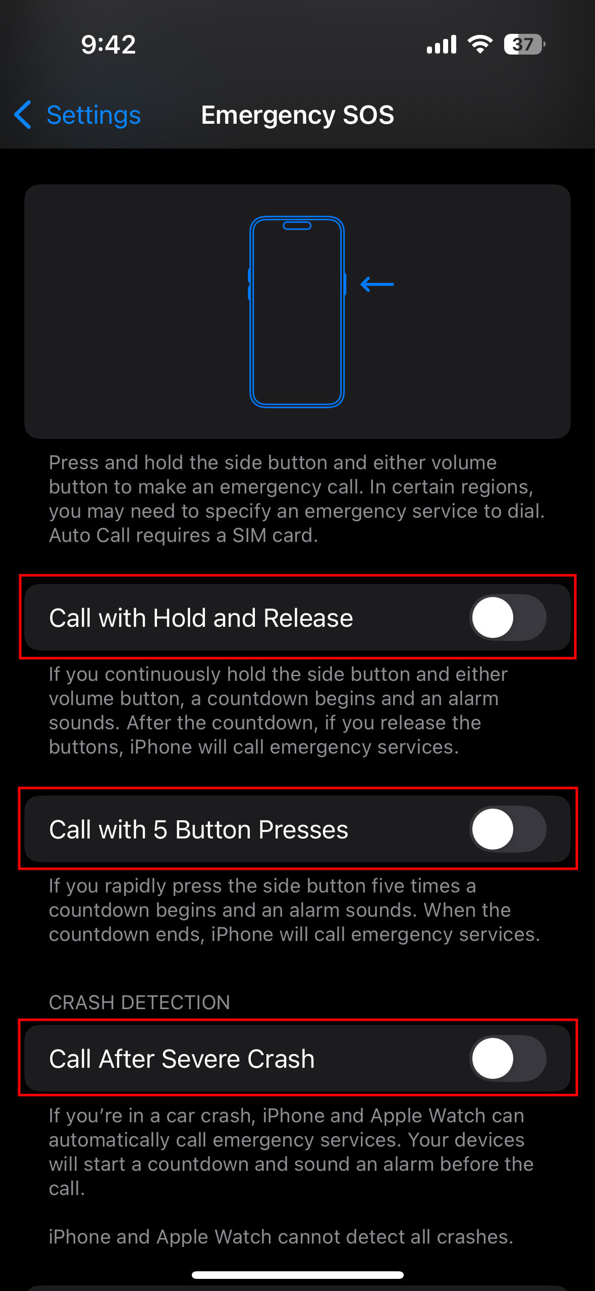 - Turn off all options. These include Call with Hold and Release, Call with 5 Button Presses, and Call After Severe Crash. The latter is only available in iPhone 14 devices or newer, running iOS 16 or later.