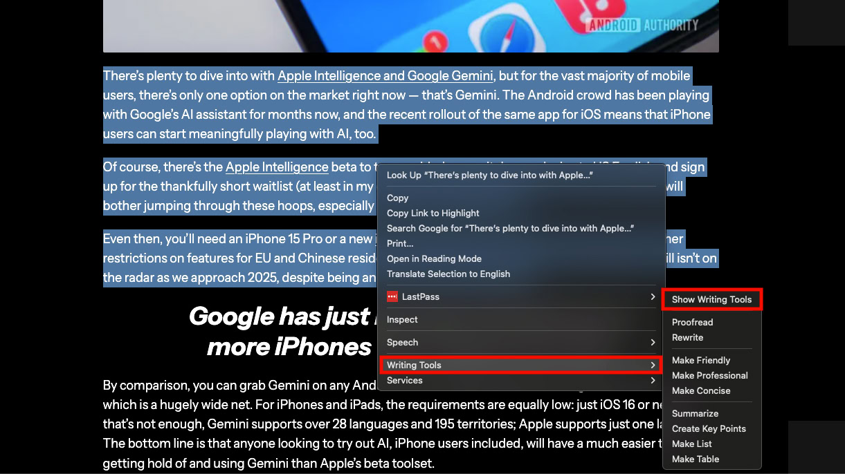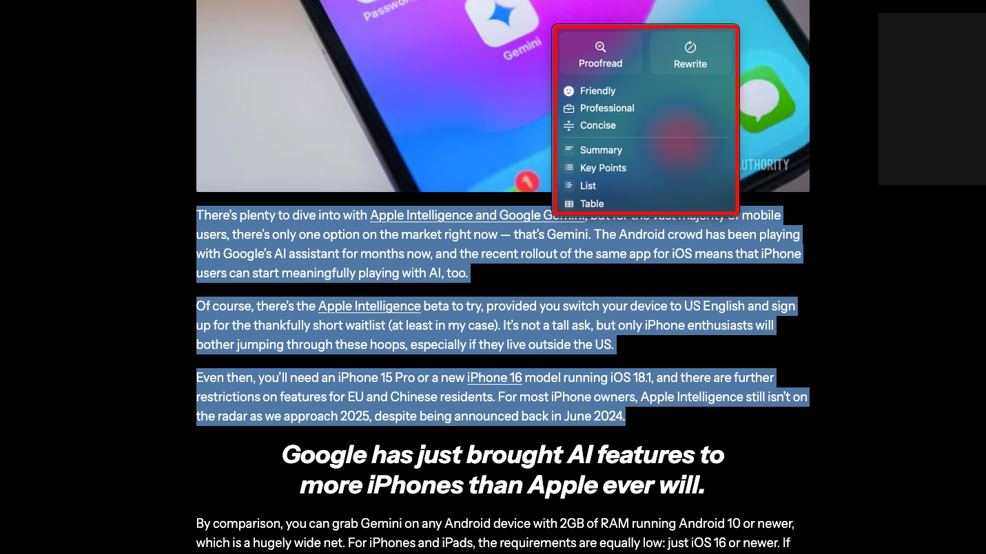 The first thing you want to try, and likely one of the Apple Intelligence features most will use more often, is Writing Tools. It basically allows you to highlight text and either summarize, proofread, or rewrite text. This will work on nearly any text, in almost all apps, whether it’s your own writing or not.