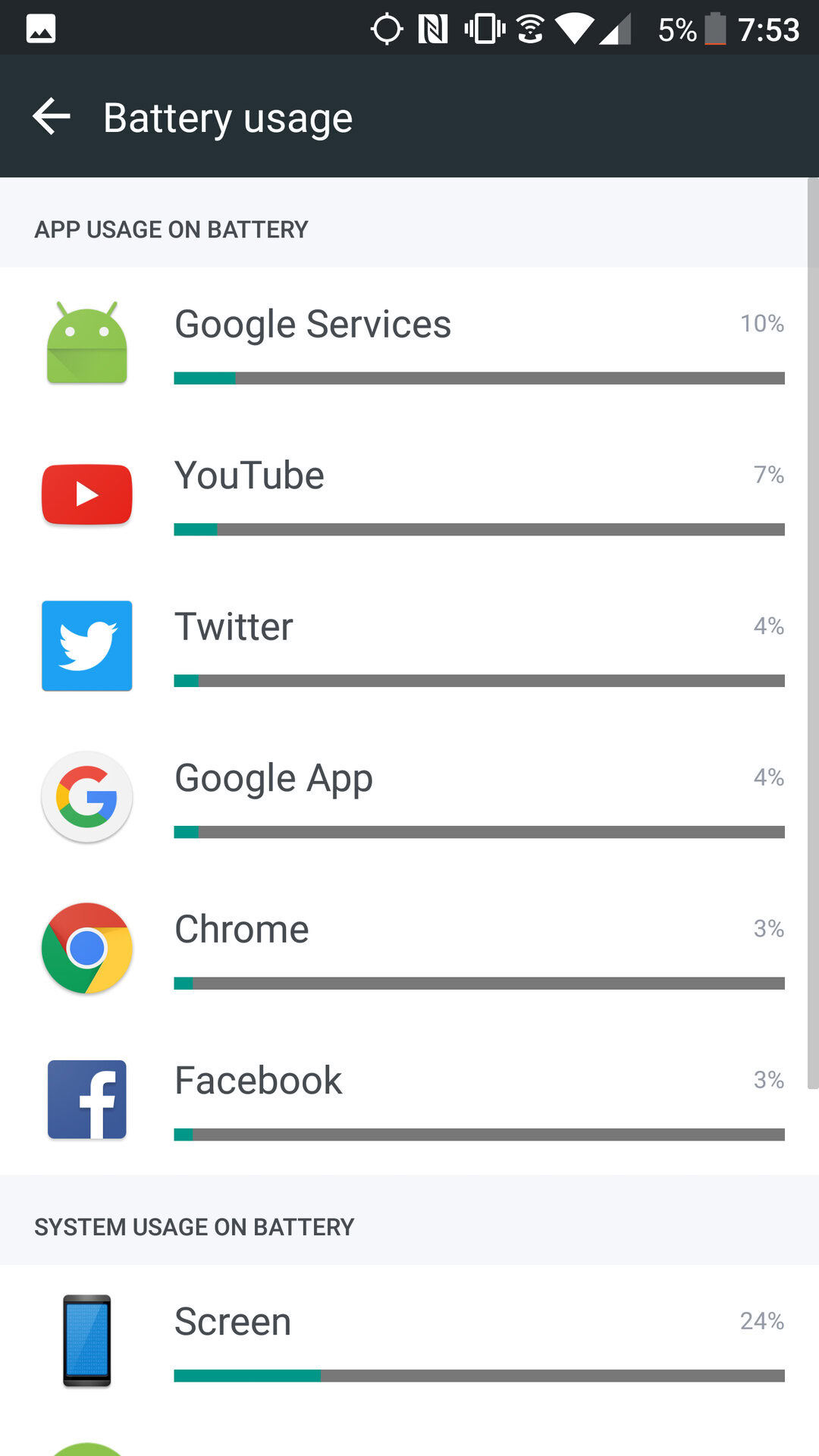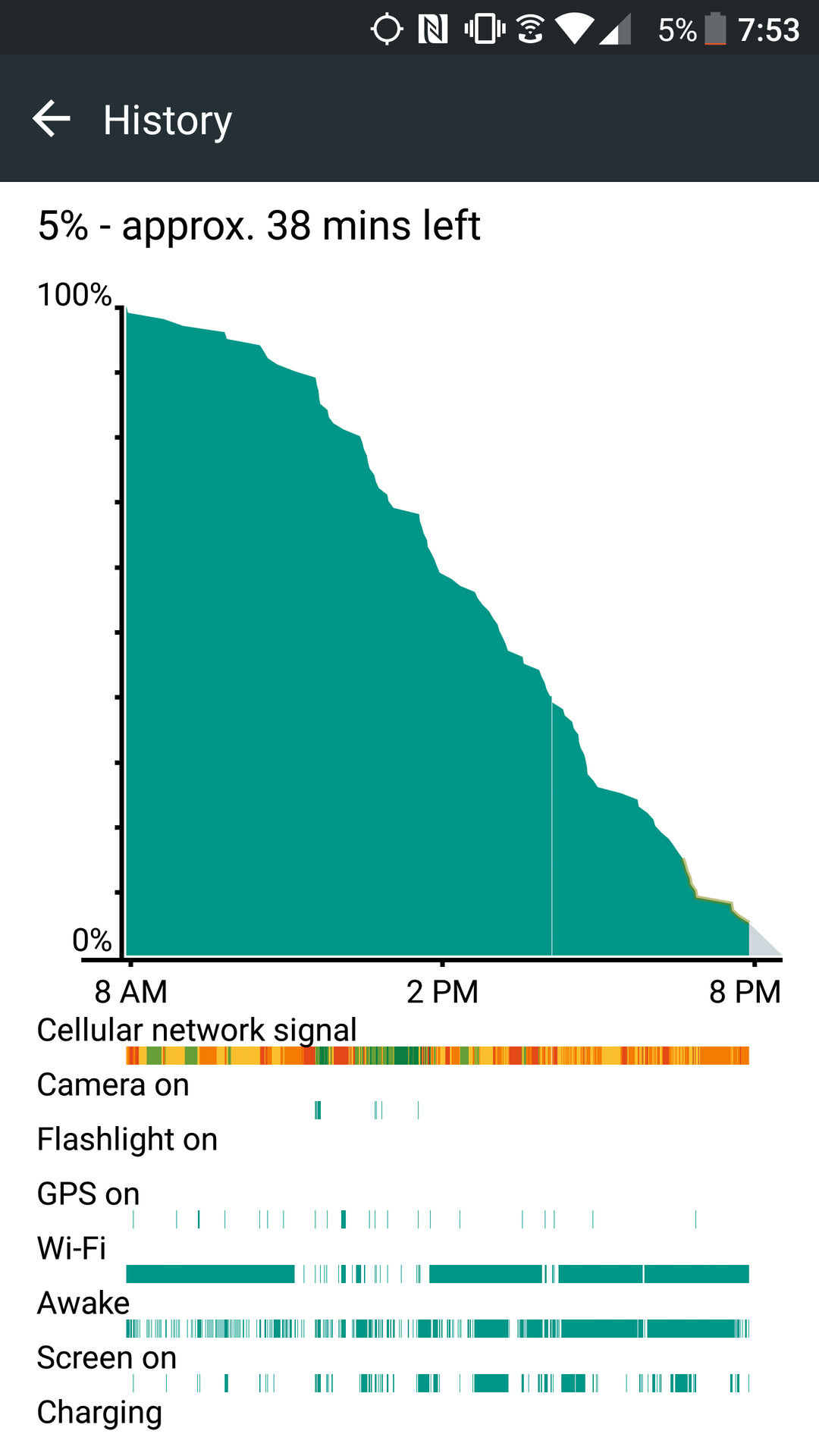 Despite a small bump in battery capacity to 3,200 mAh from the 3,000 mAh cell on the HTC10, our real world battery tests delivered disappointing results. While using the HTCBolt, we could barely make it through a full day of use while averaging just two hours and forty minutes of screen on time, as shown below.