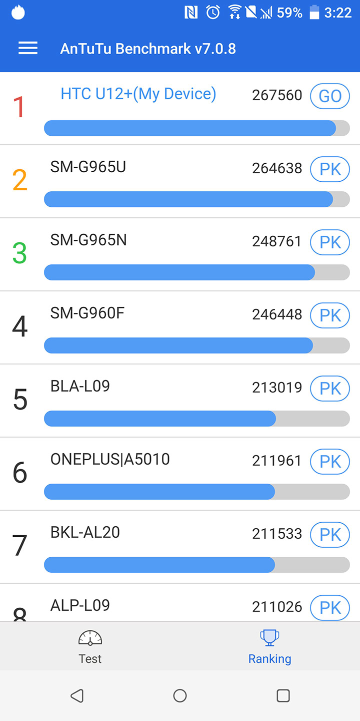 AnTuTu gave the U12 Plus a score of 267,560, compared to the OnePlus 6’s 262,614 and the S9’s 266,559.