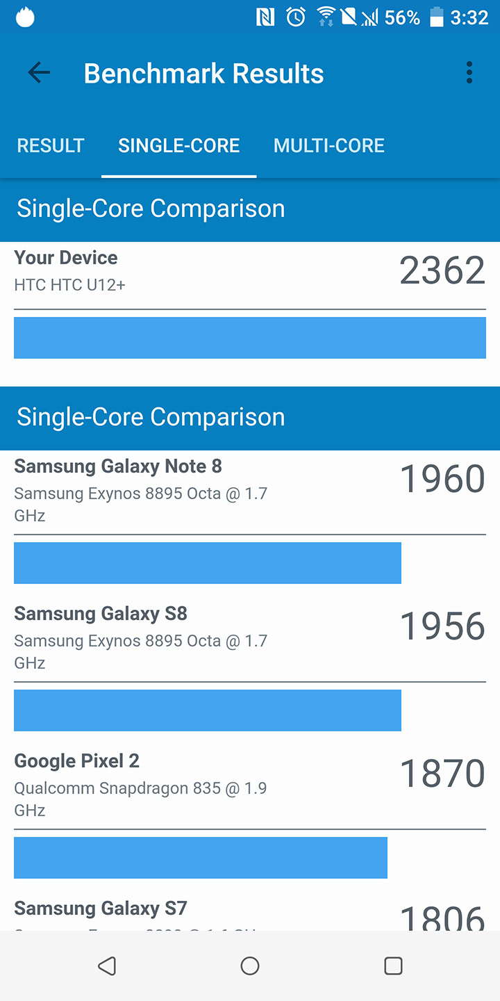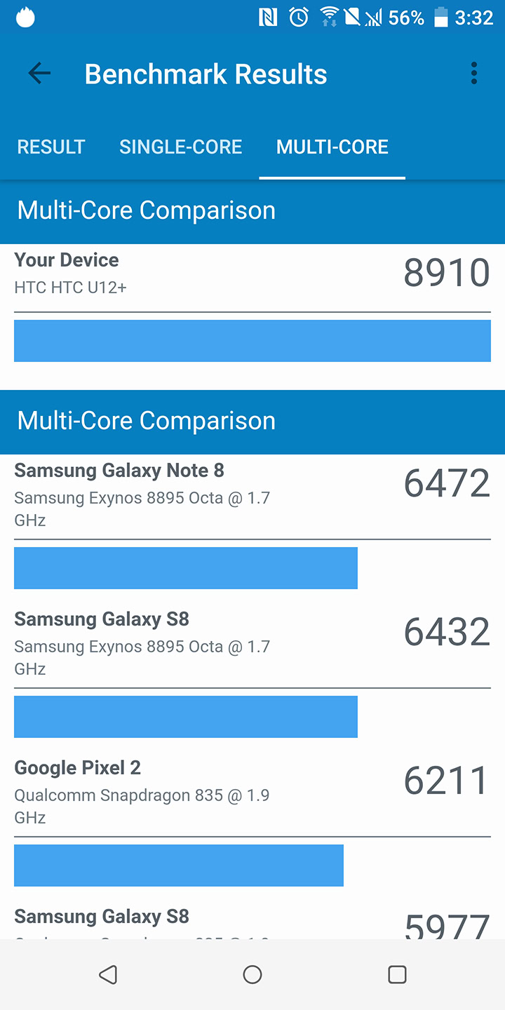 Geekbench 4 gave the HTCU12 Plus a single-core score of 2,362. In comparison, the OnePlus 6 scored 2,454, while the Galaxy S9 scored 2,144. The U12 Plus achieved a multi-core score of 8,910, while the OnePlus 6 scored 8,967, and the Galaxy S9 scored 8,116.