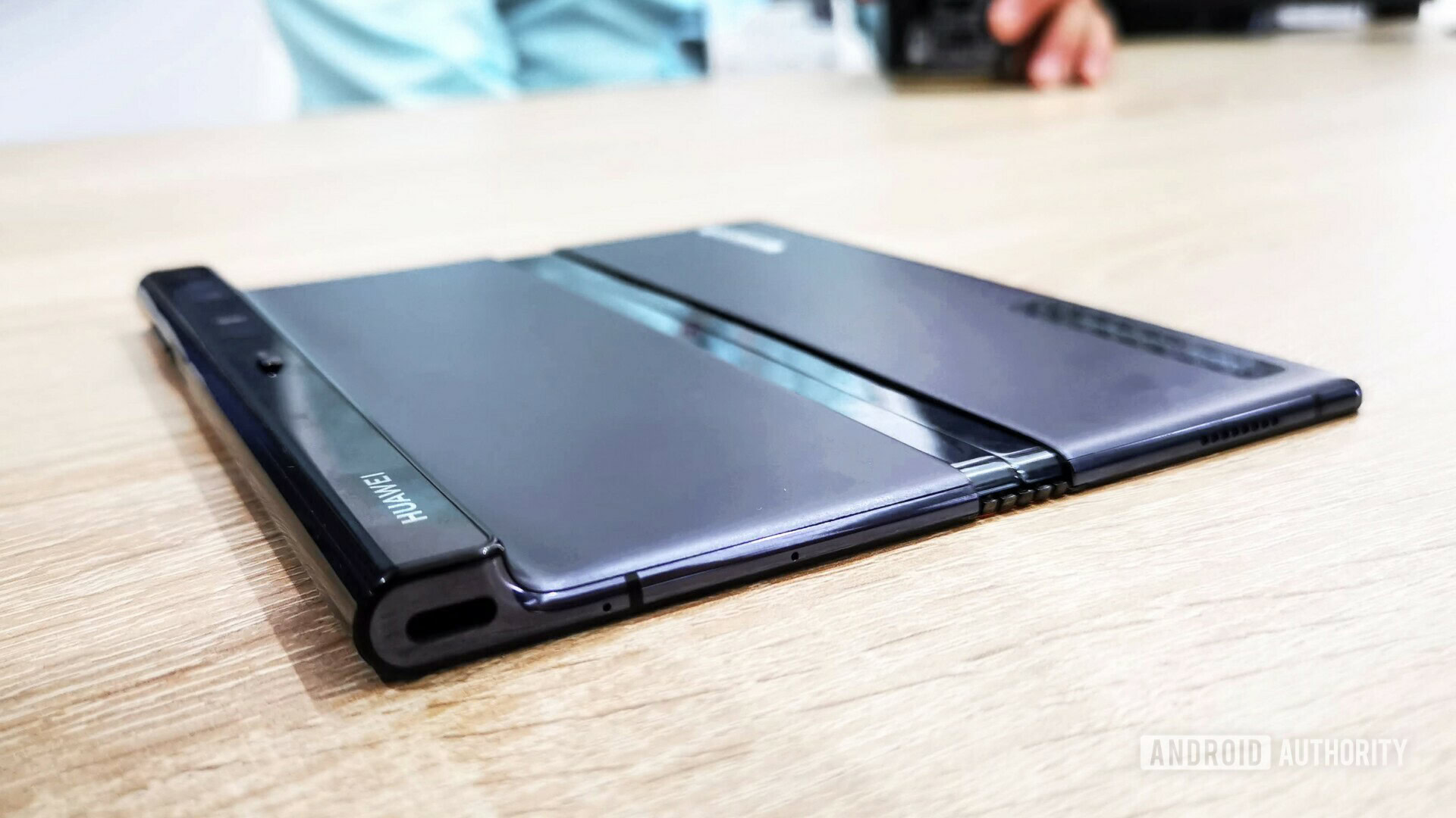 We can tell you the Mate X is just 5.4mm thick when open across most of the device, excluding the grip component. It closes up to be 11mm thick, and yes, it closes flush against itself. There’s a pill-shaped 2-in-1 power button/fingerprint scanner and a USB-C port on one end of the grip. It didn’t appear to have a headphone jack.