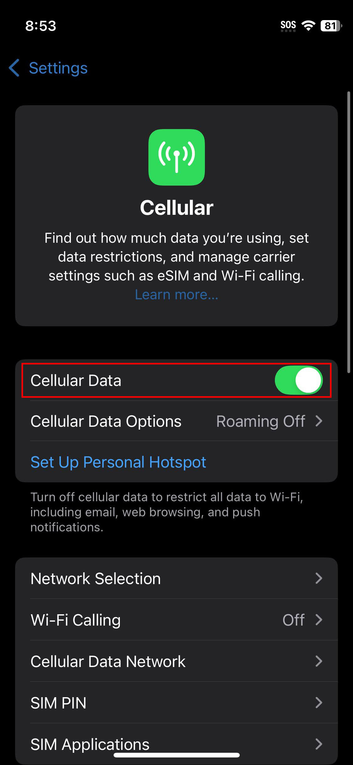 - If you’re outside your country or network coverage, also go into your main SIM and toggle Roaming on (this may incur extra charges).