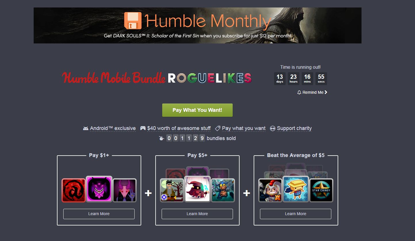In this case, the new Humble Mobile Bundle offers three roguelike games if you pay $1 or more: Desktop Dungeons from QCF Design, along with bit Dungeon I and II from Kinto Games. If you pay $5, you can add three more games to your bundle: Pixel Heroes: Byte & Magic from The Bitfather, Road Not Taken from Spry Fox, and Dungelot: Shattered Lands from Red Winter. If you pay more than $5, you can snap up the final three games: Heroes of Loot 2 from OrangePixel, Sproggiwood from Freehold Games, and the sci-fi themed Star Chindy from MASTGames.