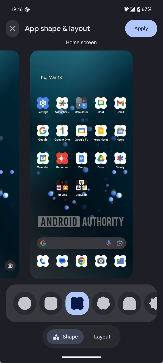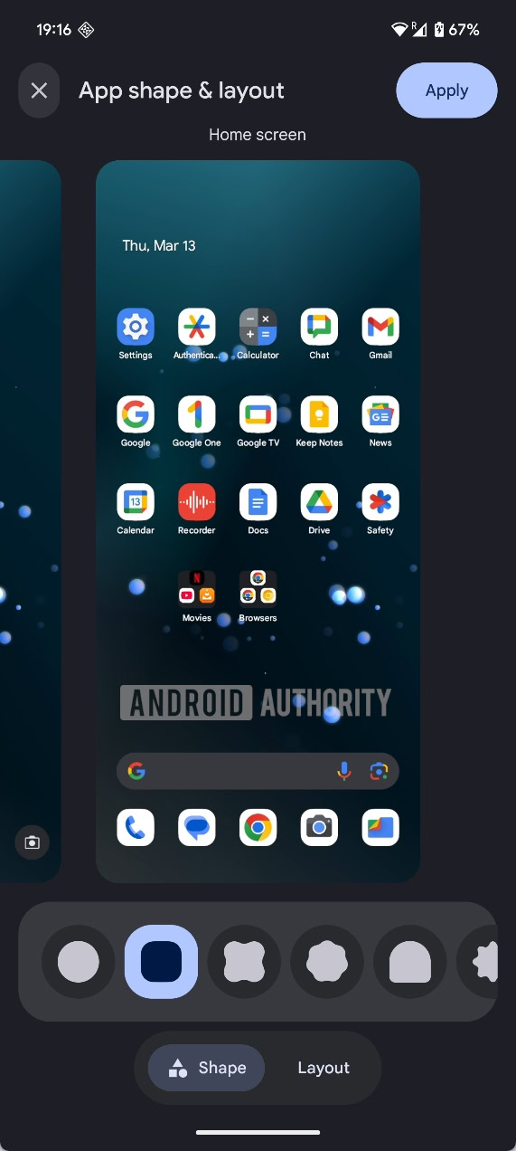 Back in November, we spotted the first signs of Google’s work to bring back icon shape customization to Pixel devices, a feature that existed in Android 11 but was later removed. In the first beta of Android 15’s second quarterly release, we discovered a new “app shape & layout” menu in the Pixel wallpaper app. The menu featured two tabs: Shape and Layout. The Shape tab offered six options for changing home screen icon shapes, while the Layout tab provided several options for adjusting the home screen grid layout.