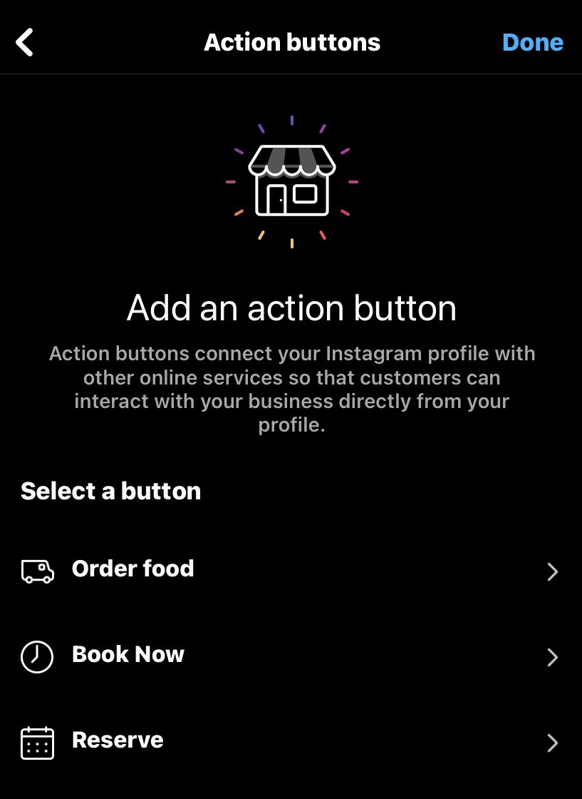 - Call to action button (CTA) — a CTA is when you ask the visitor to do something specific, like sign up for your newsletter, visit your website or shop, or make an appointment to meet you. Below are the CTA options for Instagram, which are all strangely business-related. It would be nice to see a newsletter signup button in there.