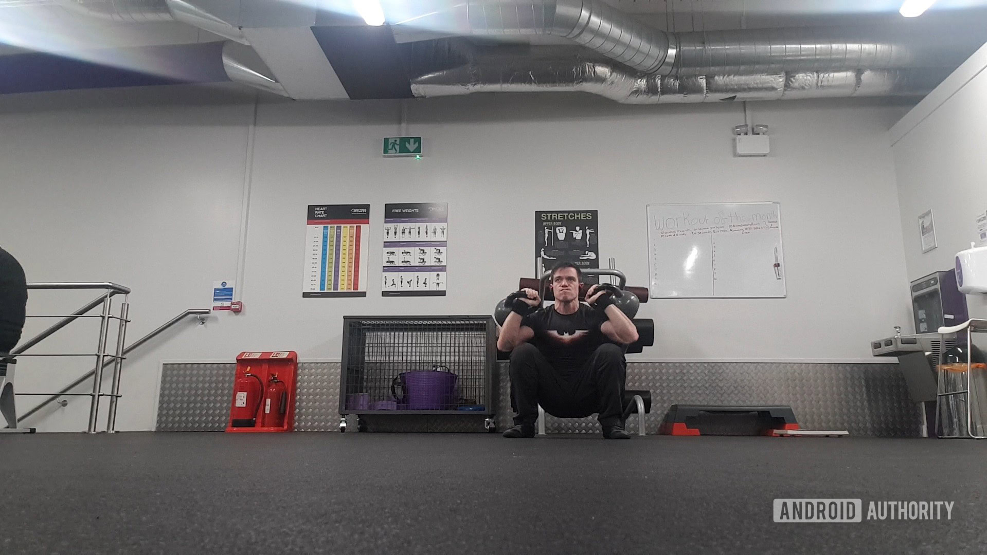 If you need more weight, you can alternatively take two kettlebells and hold them in the “racked” position while squatting. This means they will be held at shoulder height, with your wrist straight and the kettlebell leaning against the side of your forearm and bicep. This position allows you to comfortably hold the weight for long periods while challenging your legs through a wider range of motion.