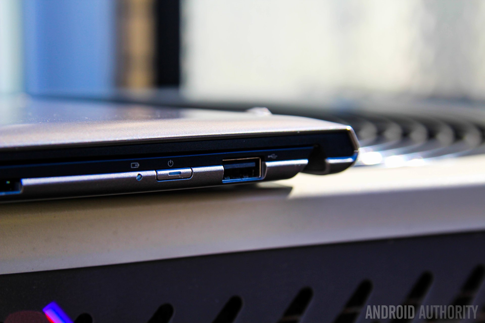 Looking around the laptop, on the left side is where you’ll find a proprietary charging port, a USB 3.0 port, a mini-HDMI port, and the headphone jack. On the right is a USB 2.0 port, the power button, and a SD card slot. On the bottom are some small rubber feet, that keep the device in place when resting on a table or any other flat surface. These rubber feet also keep the laptop slightly elevated, which is particularly useful when using the speakers. The speakers are also placed at the bottom, but do sound surprisingly decent, and don’t get muffled because of their unfortunate placement, because of the rubber feet.