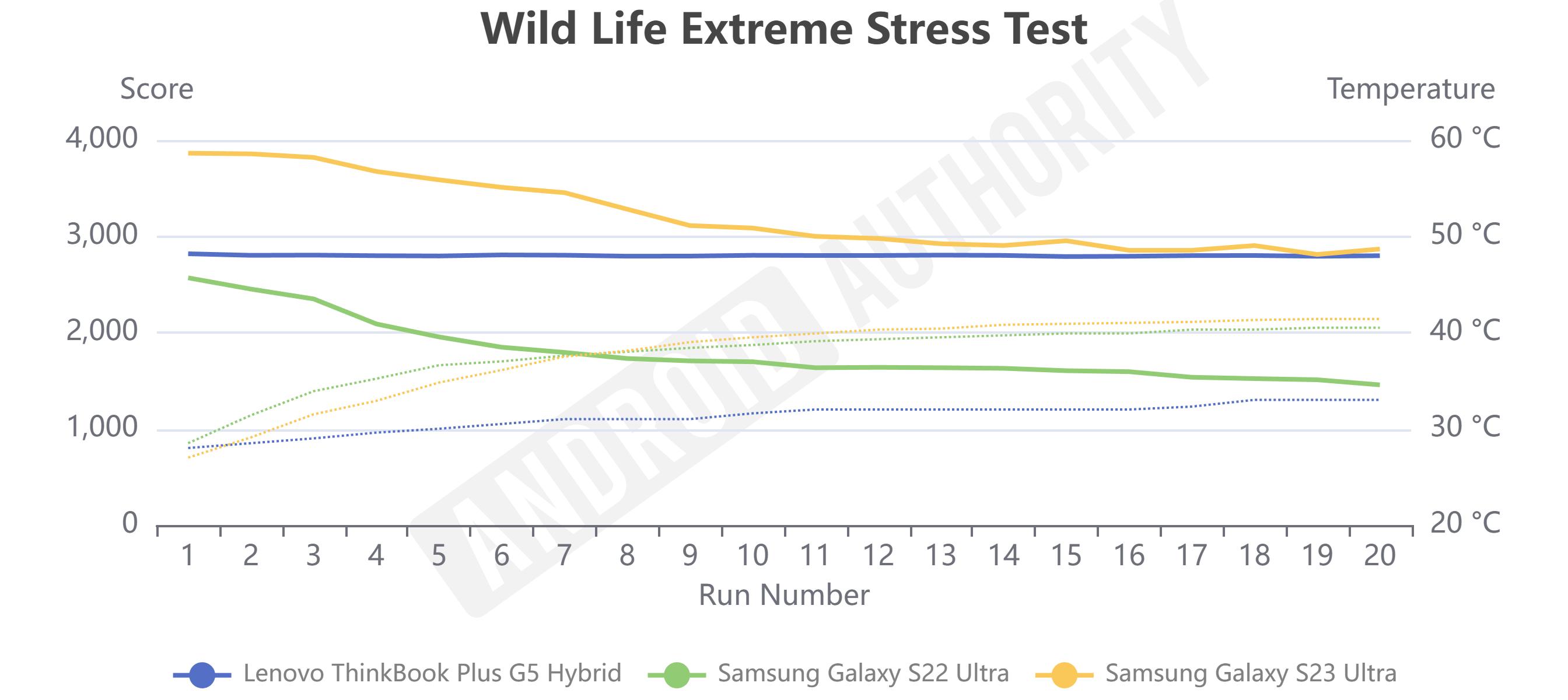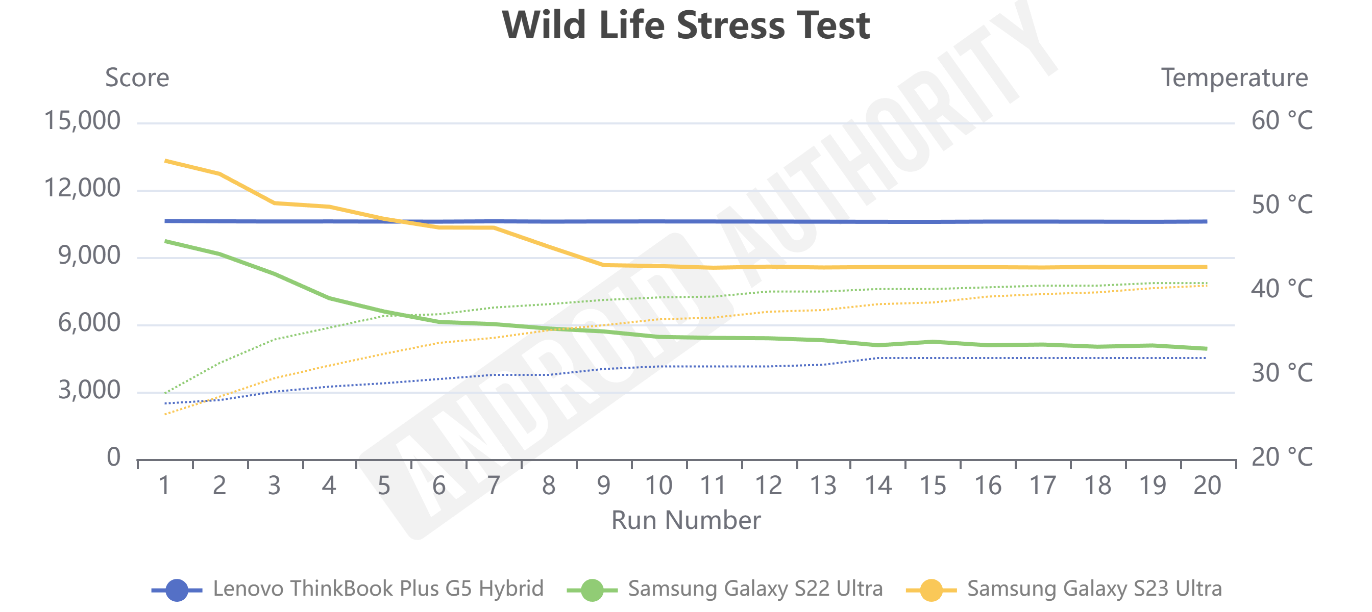 First, the specs here are top-notch. The Snapdragon 8 Plus Gen 1 in the Hybrid Tab is a few years old but still a beast. Not many tablets have landed with this processor, but our benchmarks show it being very close to a Samsung Galaxy S23 Ultra in terms of sustained CPU and GPU performance, which is interesting because the S23 Ultra has the technically superior Snapdragon 8 Gen 2. This result is primarily due to the size and construction of the tablet — the Hybrid Tab is simply better at keeping cool, so it can be pretty close to the real-world output of the Snapdragon 8 Gen 2.