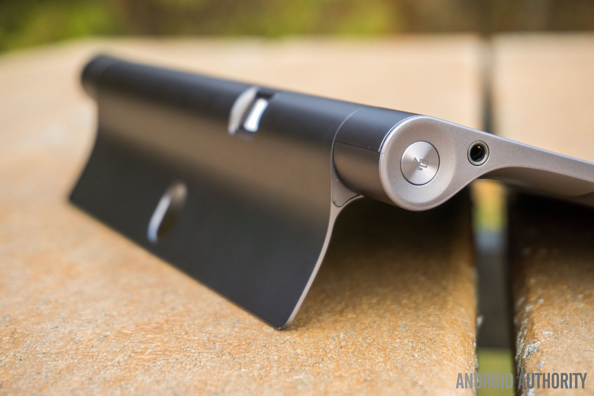 Taking a look around the device, the power button is on the right side of the cylinder, with a notification LED ring around it, and below you’ll find the microUSB port and the volume rocker. On the opposite end of the cylinder is the button to power up the pico projector, which has now been moved to just off center of the tube, instead of at the end of cylinder as seen with the Yoga Tablet 2 Pro, and below the projector button is the headphone jack. The placement of the power button and the projector button can take some getting used, and you might find yourself accidentally triggering the projector initially. Opening the kickstand reveals a plastic cover that houses the microSD card slot.