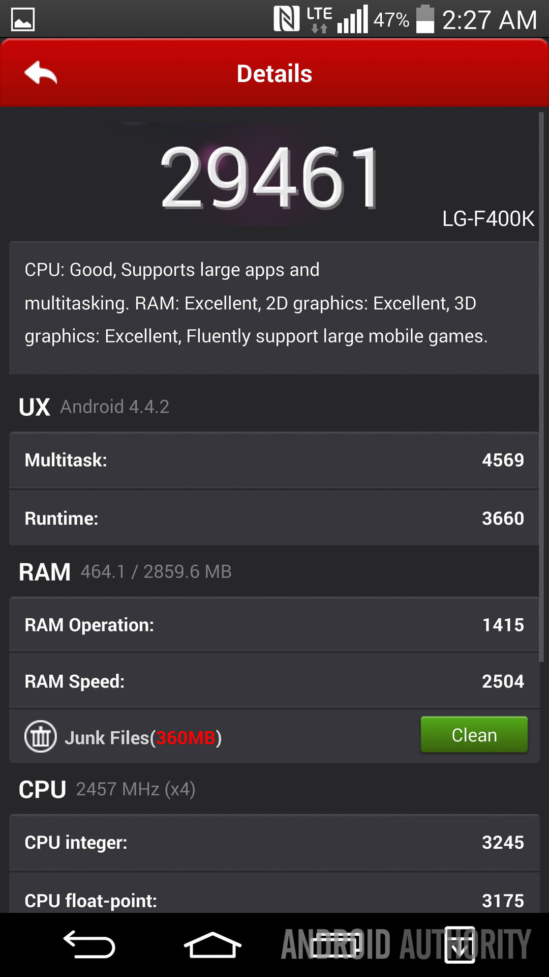 Across several sessions of benchmarking using the latest version of AnTuTu, the LG G3 obtained an average score of 29760, which is behind other current flagships. However, our own experience using the device does not reflect the gap in the benchmark scores, as the G3 was on par with every other phone out there in terms of performance.