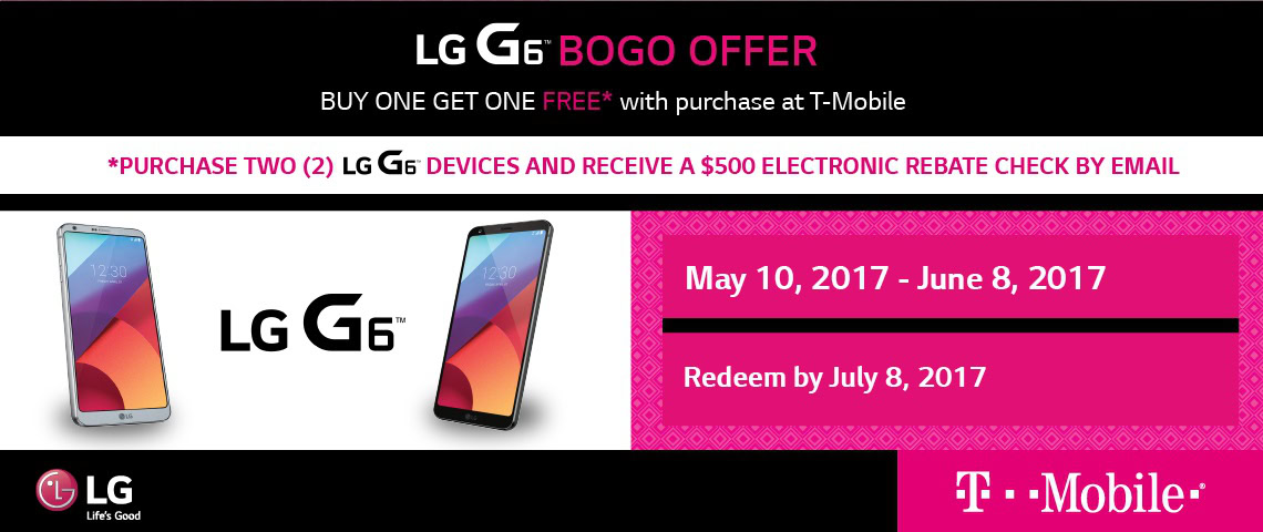 Original story (May 12): T-Mobile has launched a buy one get one free (BOGO) offer on the LG G6: purchase two of LG’s latest flagship from participating stores between now and June 8 and you can get a $500 rebate via email.