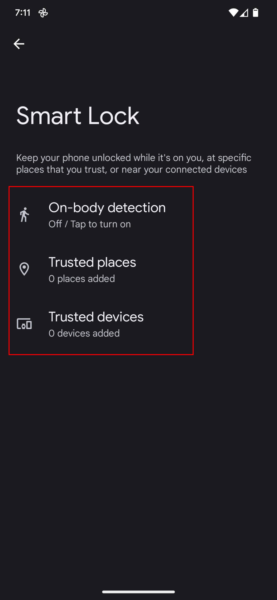 - Select On-body detection, Trusted places, or Trusted devices.