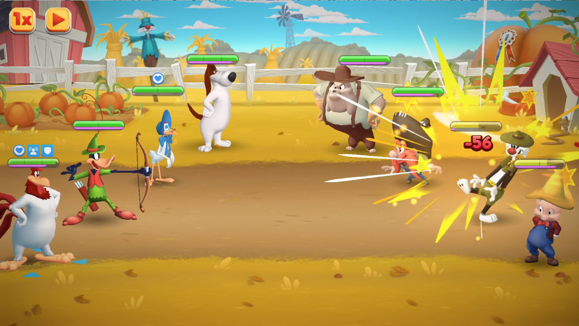 Whether you play by yourself or against others, you fight with four-character teams in turn-based battles. World of Mayhem features over 70 characters from the Looney Tunes franchise, such as Bugs Bunny, Daffy Duck, Elmer Fudd, Tweety Bird, Foghorn Leghorn, and many more.