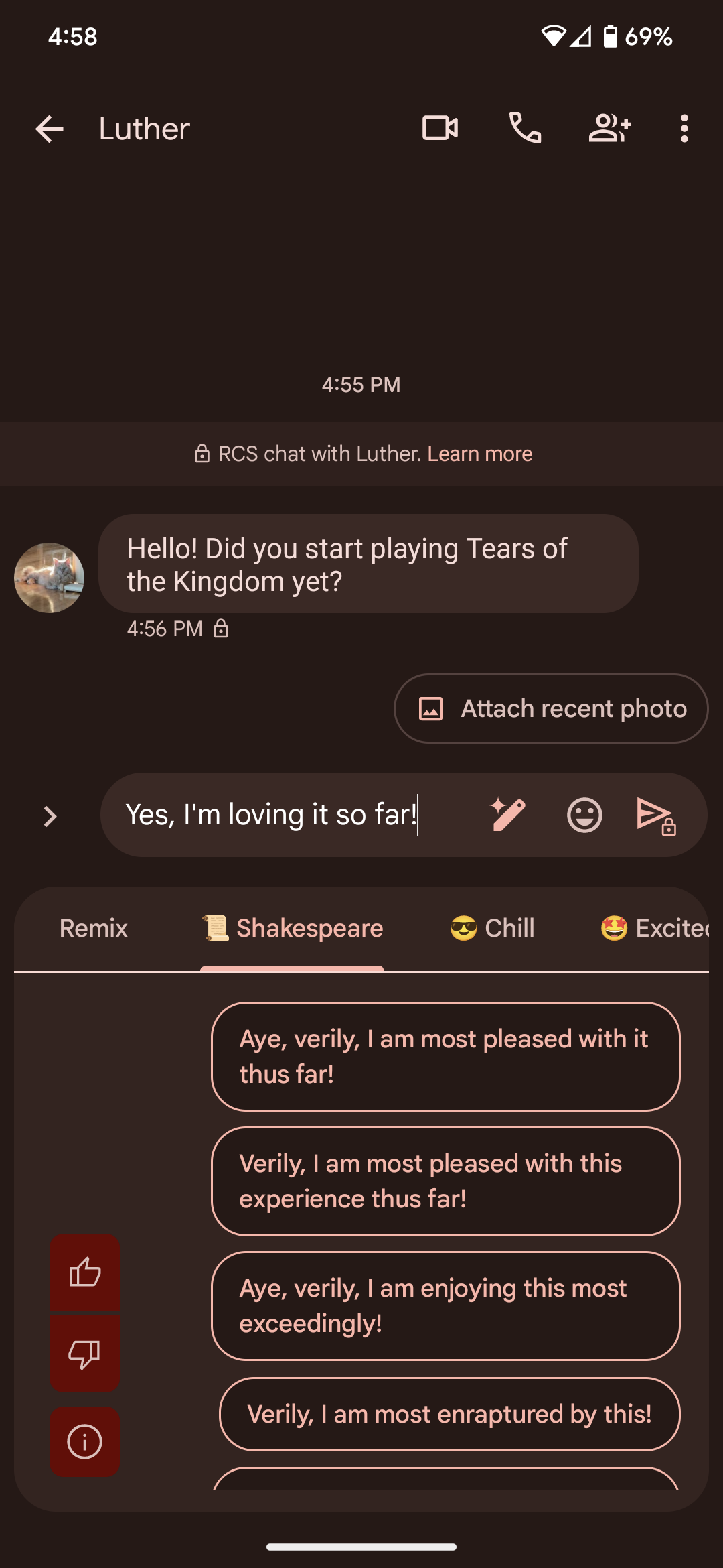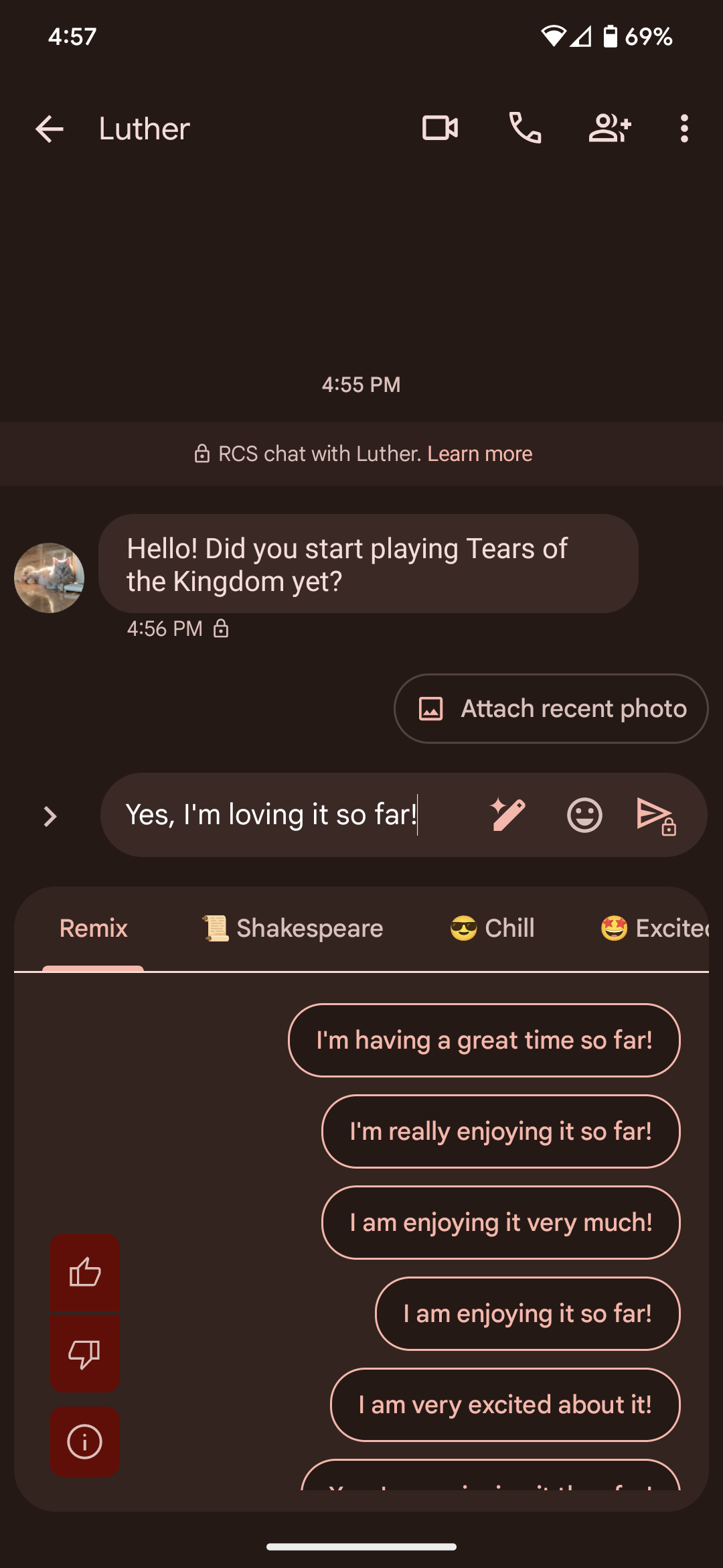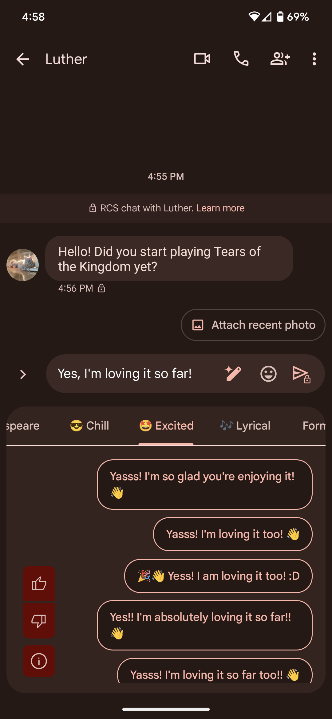 Regardless, the “Yes, I’m loving it so far!” response makes sense, so I select it. Unlike Smart Reply, tapping the preferred option doesn’t automatically send the message. Instead, it just moves the text into the text box. I can then hit the “Send” button or edit it. Let’s do some editing now!