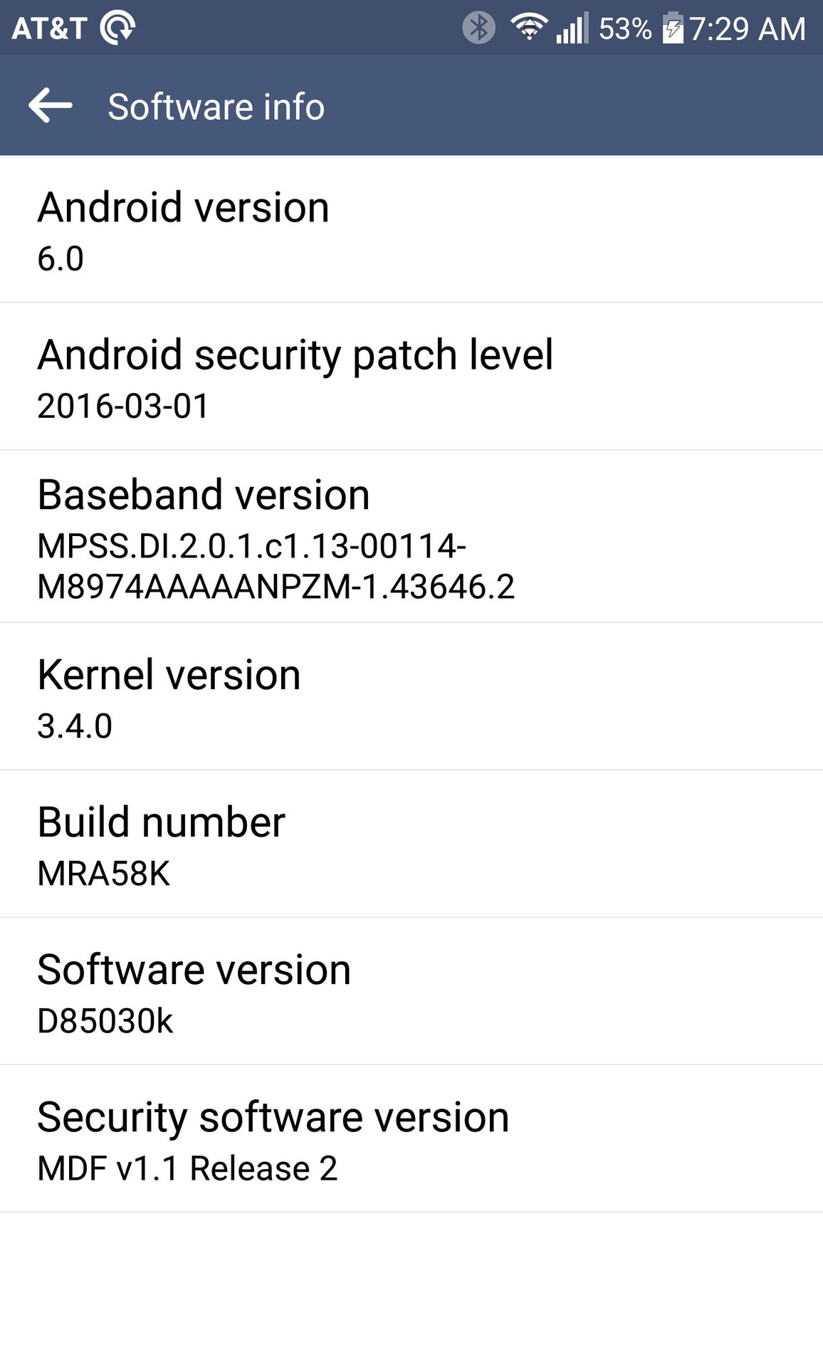 On AT&T, the LG G3 Marshmallow update brings the build number to MRA58K and the software version to D859030k. The update incorporates the March 1 security patch, according to a screenshot we received from one of our readers.