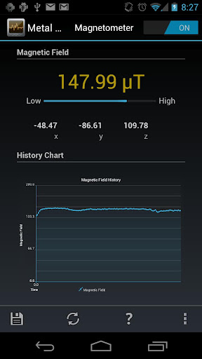 The Metal Sniffer uses the device’s magnetometer to detect nearby electromagnetic fields. If you are a newbie when it comes to metal detection and magnetic fields, a help button is readily available to provide you with the much-needed information about magnetic fields and also about using the app. The app displays the X, Y, Z components of the field and plots a live graph in the form of a history chart.