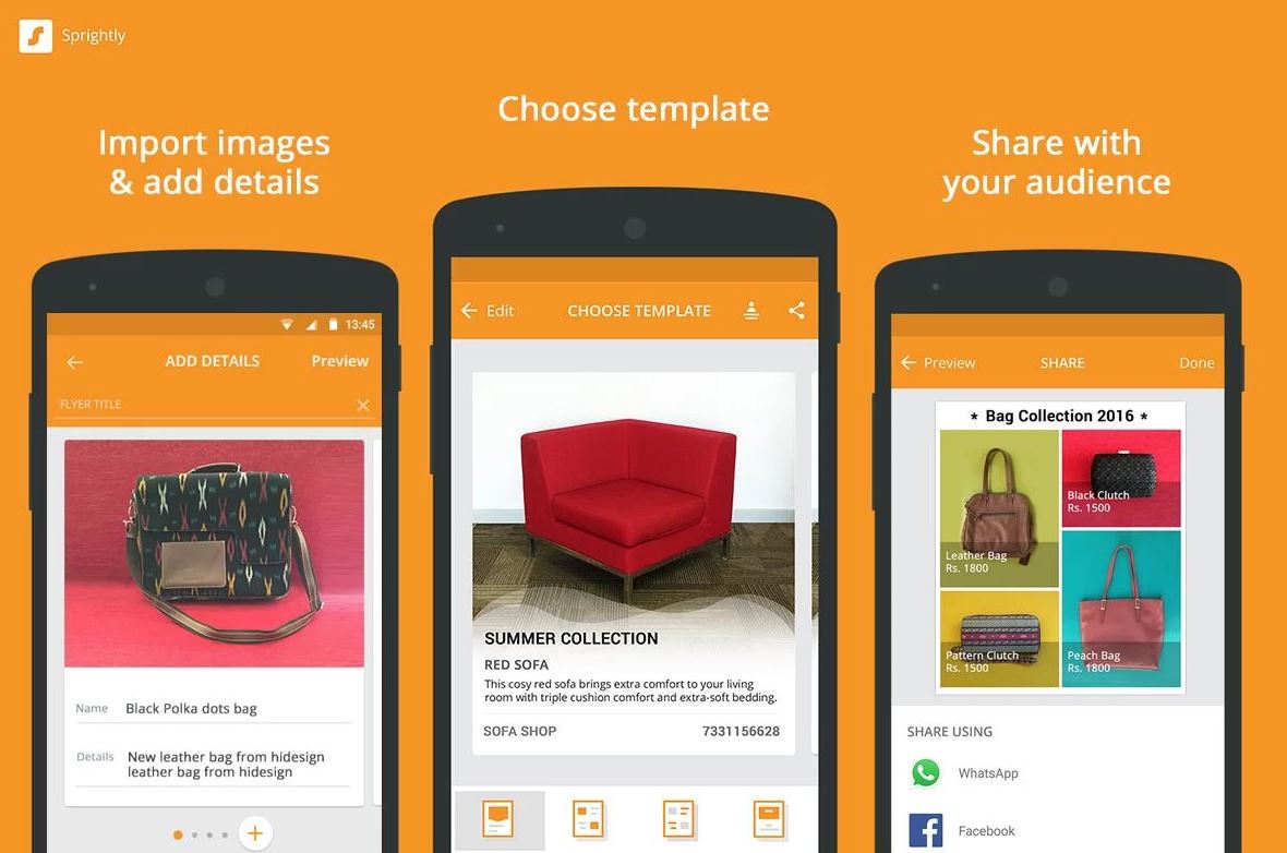 First, let’s take a look at Sprightly. It’s a slick little app that offers possibilities for your business life and your personal life. Although you can use its few-taps interface to quickly design professional looking catalogues or product price listings for publication on digital platforms like Facebook or Twitter, you can also create personalized ecards to send to your friends and family. The “Collection” feature lets you group together frequently used images so that developing a brand is a snap. The goal is to make promotional content creation as quick and easy as possible while still maintaining a professional level of quality.