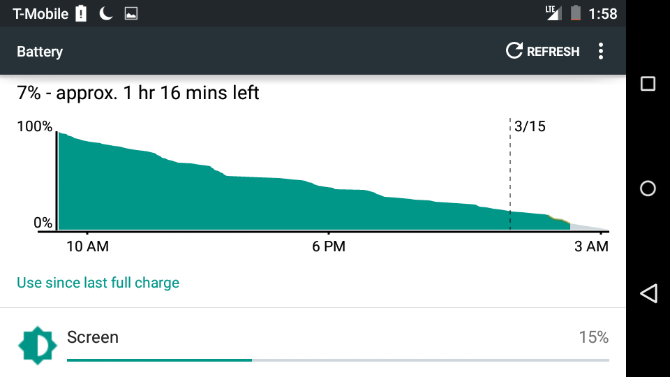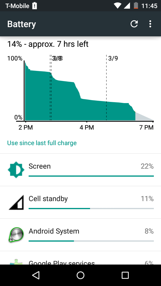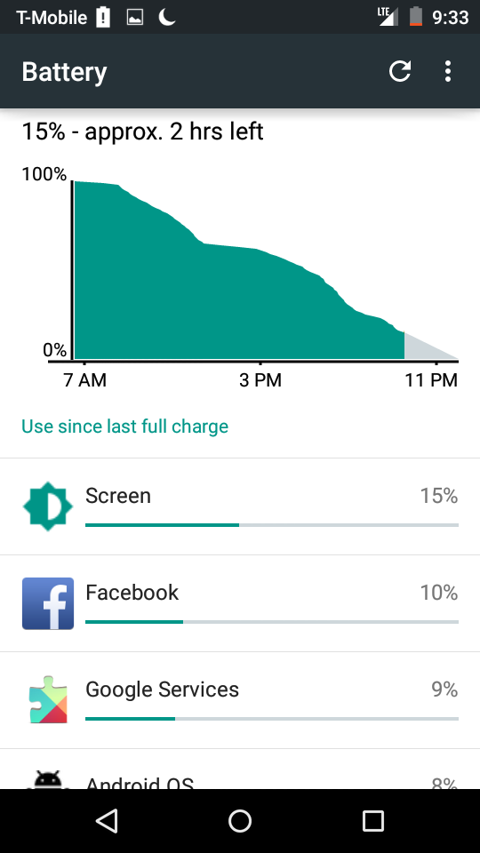 The Moto E (2015) packs a 2,390 mAh battery, and while it may seem a little small, it is actually more than enough considering everything it has to power, such as the small, low-resolution display. Even with a lot of gaming and taking a ton of pictures, the screen-on time never went below 5.5 hours, and on low usage days, where it mostly about texting and keeping up with social media, the device managed upwards of 6.5 hours of screen-on time, so it’s not unreasonable to expect at least a day and half of battery life from the Moto E (2015).
