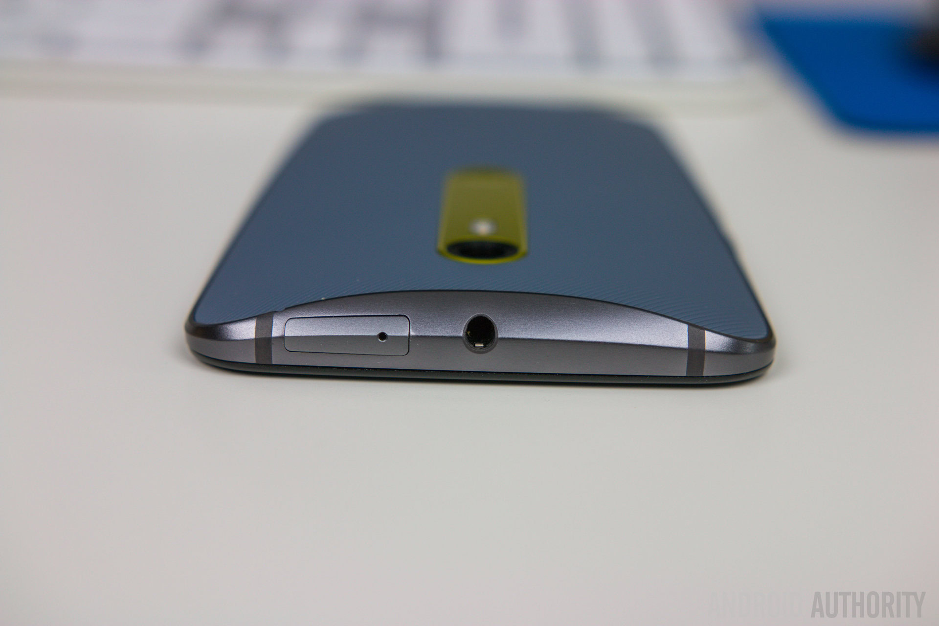 Taking a tour around the rest of the device, the buttons and ports are in pretty typical locations for a Motorola device. The power/standby key and volume buttons can be found on the right side, where they’re very easy to reach. The power button has a nice ridged texture that makes it really easy to find, which is a great touch. The bottom side houses the microUSB port, and up top sits the 3.5mm headphone jack in the center, with the Nano SIM card tray – which doubles as a microSD card slot – sitting slightly to the left.