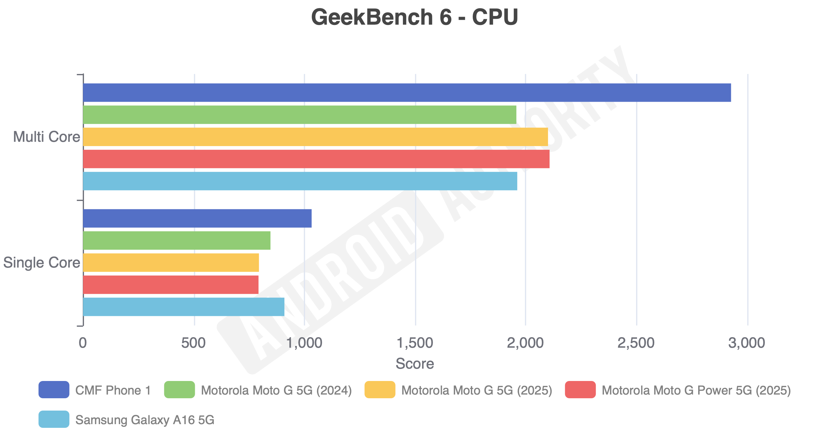 Interestingly, though, that’s not the story our controlled benchmarks tell — at least, not entirely. As always, I loaded up our slate of CPU and GPU tests and set the Moto G (2025) to run its course before stacking it against a few of its siblings and some of its closest rivals. To my surprise, it largely kept pace. Sure, it came up a little short in the single-core Geekbench 6 performance, but then it jumped ahead of its predecessor and Samsung’s Galaxy A16 5G in the multi-core stage of the test.