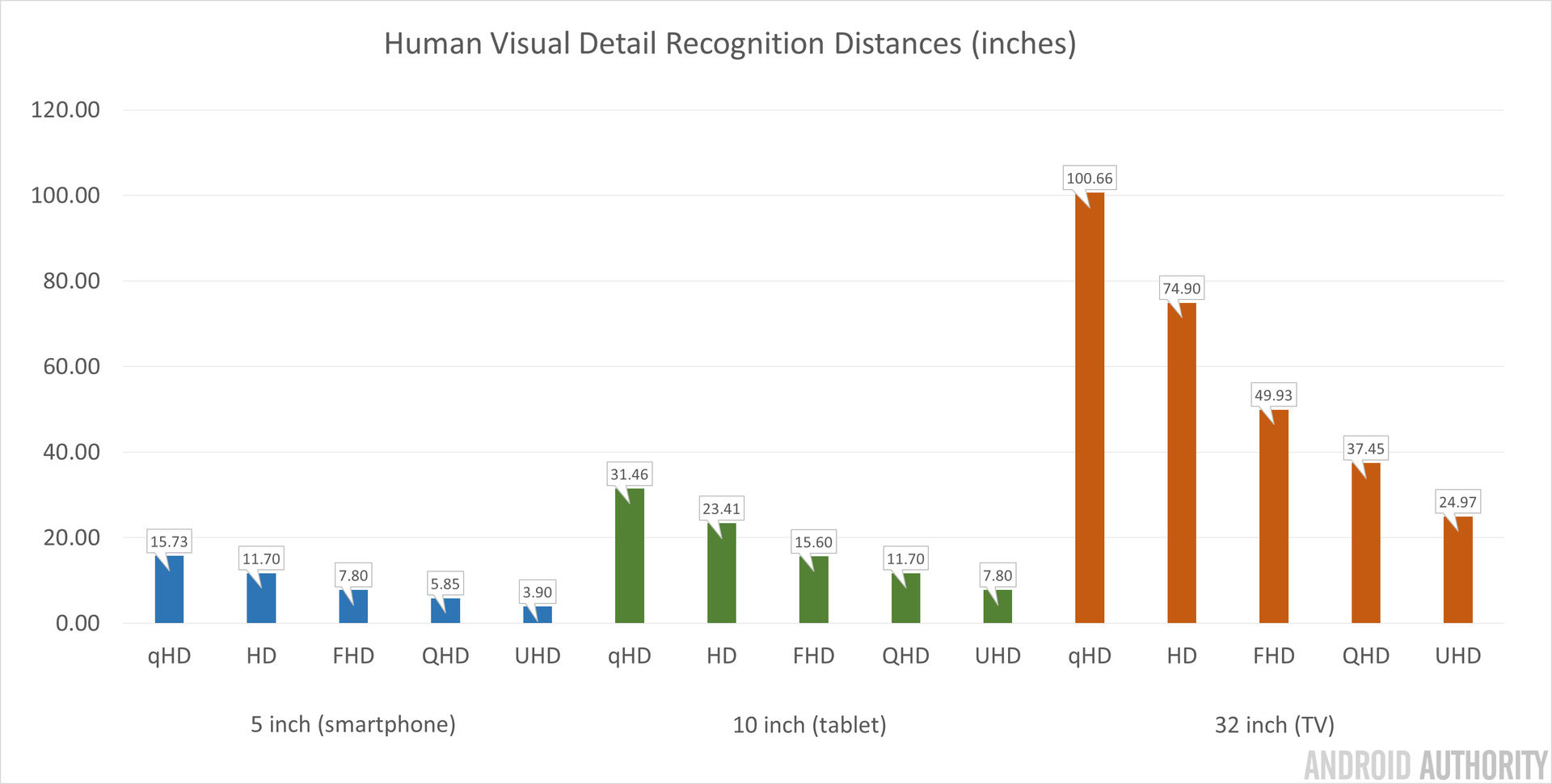Roughly speaking, you will probably struggle to notice individual pixels on a 5 inch 1080p display at a distance of around 8 inches, which is quite a typical viewing distance, but on a 4K display you’d have to be around 4 inches away to notice them, which is rather close. For 10 inch tablets, UHD pixels can be noticed at around 7.5 inches away, which is probably as close as you’re likely to hold your tablet to your face, whilst pixels on a 10 inch 1080p display would be visible within 15.5 inches. The chart below should demonstrate this concept a little better.