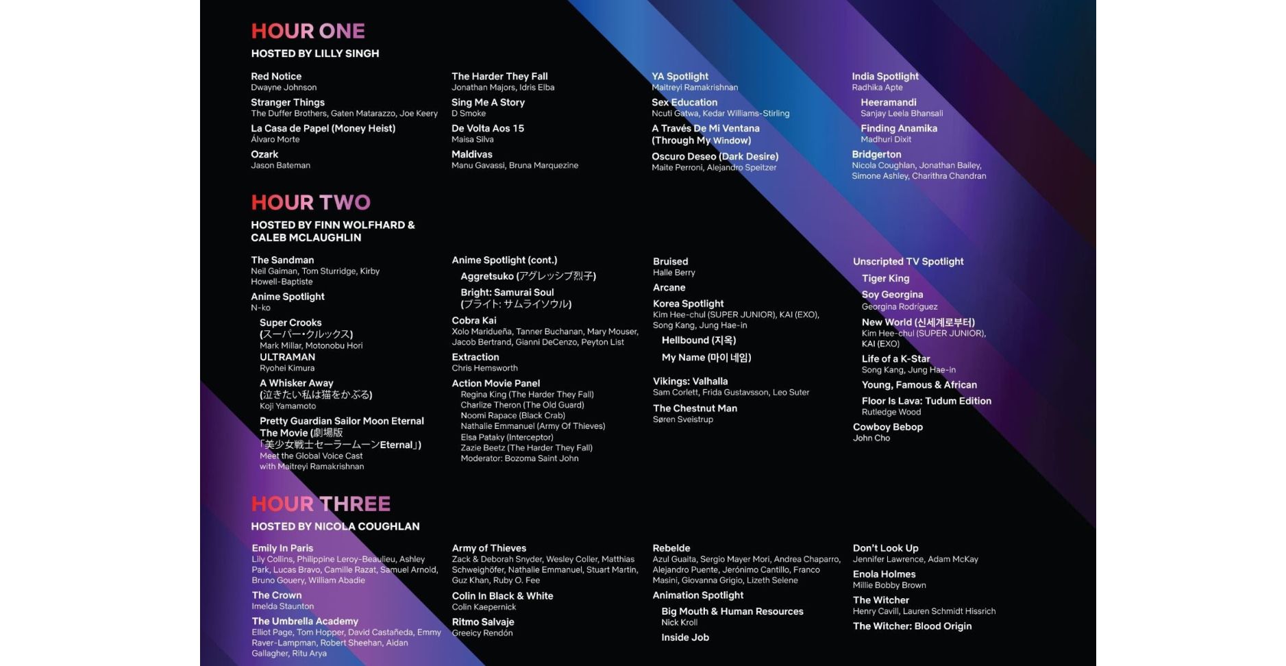 Netflix has sent out a list of just some of the shows and movies that will be spotlighted in each hour of Tudum. Each hour will have an overall host or hosts. Here’s what you can expect from each hour: