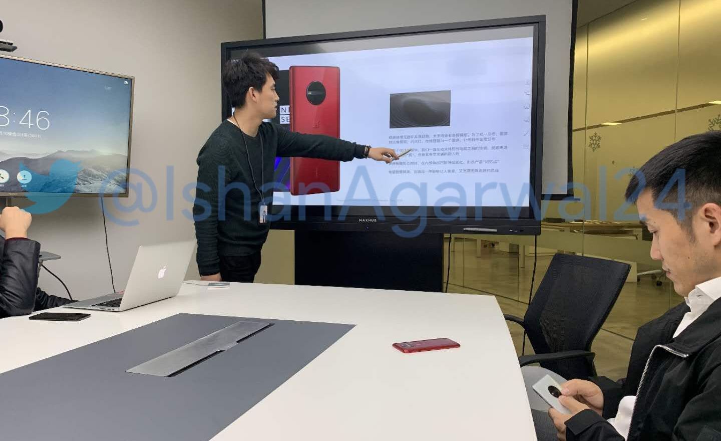 The image shows what looks like the back of this OnePlus phone prototype, which can be seen in a presentation slide, along with an actual real phone placed on a meeting table. The most notable feature of this phone is that it has some kind of circular housing for its rear camera sensors, which looks similar to recent Motorola smartphones.