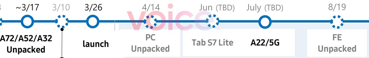 - Evan Blass published a mini product roadmap (as you can see above) of unannounced Galaxy devices, including the A22, plus Blass mentions the A82 for July, and adds a Galaxy S21 FE launch event for August this year.