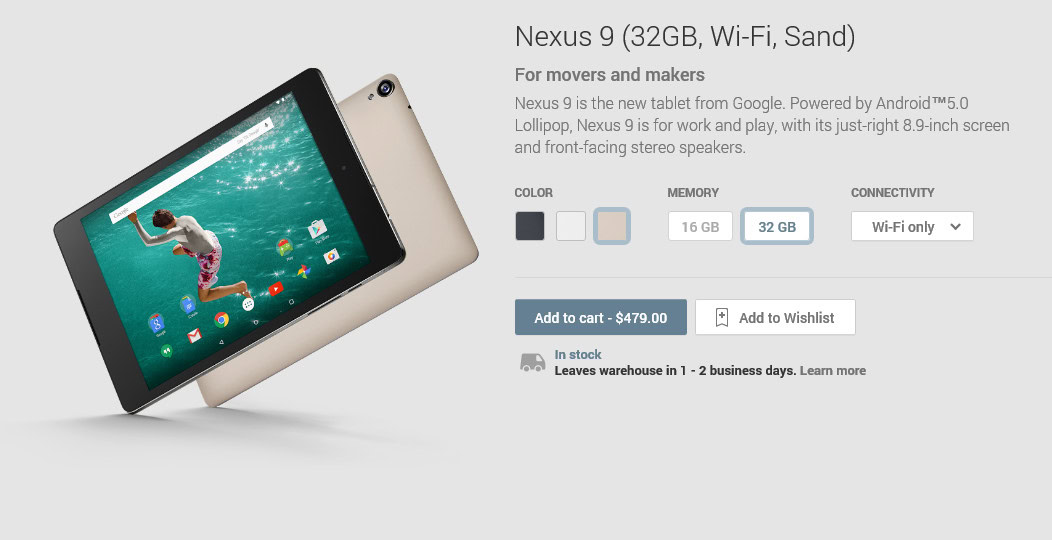 Only the 32GB storage option of the Sand Nexus 9 is available as of right now, with a price tag of $479 and a 1 to 2-day shipping window. This goes for the WiFi-only model, as the LTE-enabled model is still only available in Indigo Black.