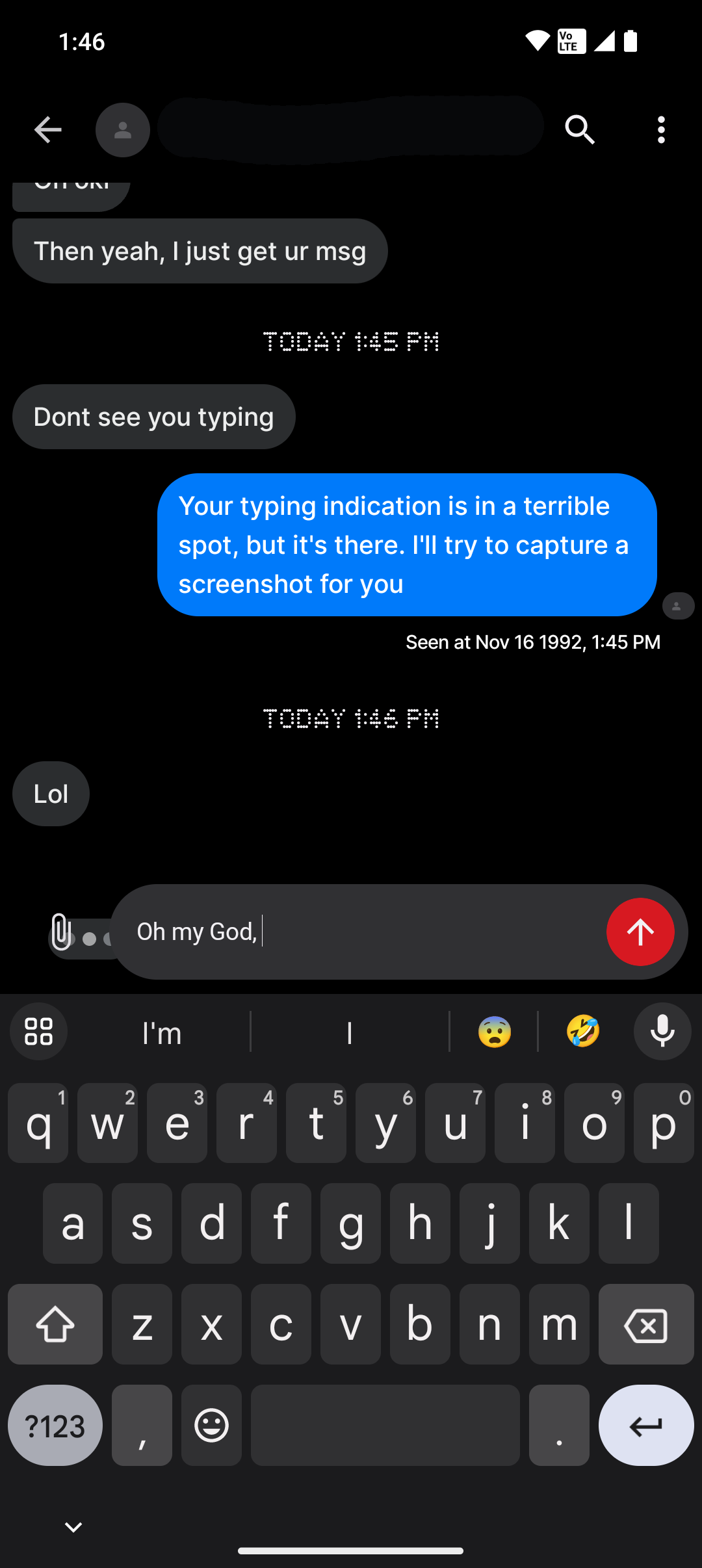 The rest of the items on the list only partially work. Live typing indicators, for example, don’t work for short messages, presumably because of the significant delay between when someone starts typing and when that activity information is transmitted to the other phones in the chat. If someone is typing a long paragraph, you’ll be able to see the indicator, but if you’re firing out brief statements, there won’t be enough time for the indicator to appear. This applies to both sides of the conversation.