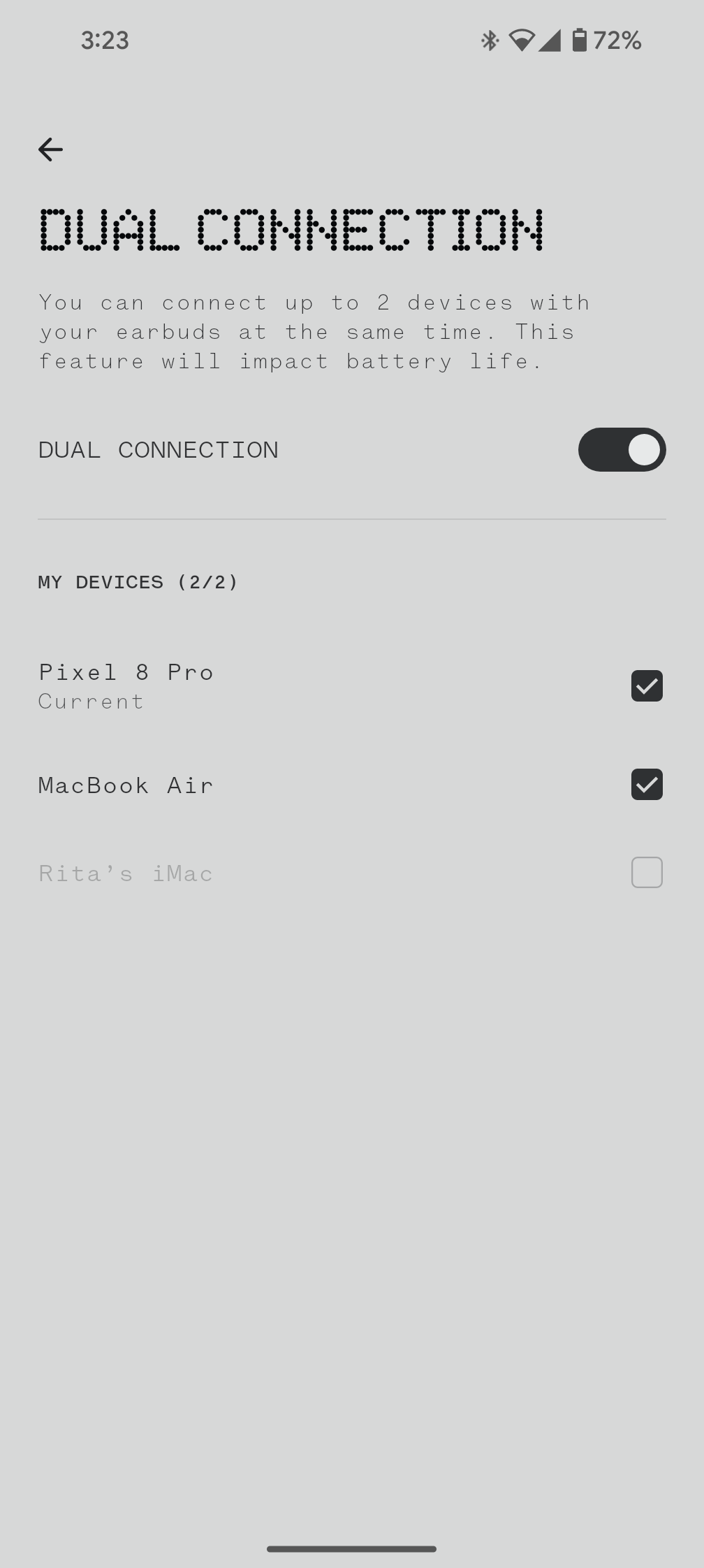 The dual connection feature is still a welcome bonus over the older Ear 1. Being able to connect two devices simultaneously and save more in the app means I only need to pair these once with my many Android phones, tablets, iMac, MacBook, and Chromecast, then toggle on or off the devices I want to activate at any point in time.