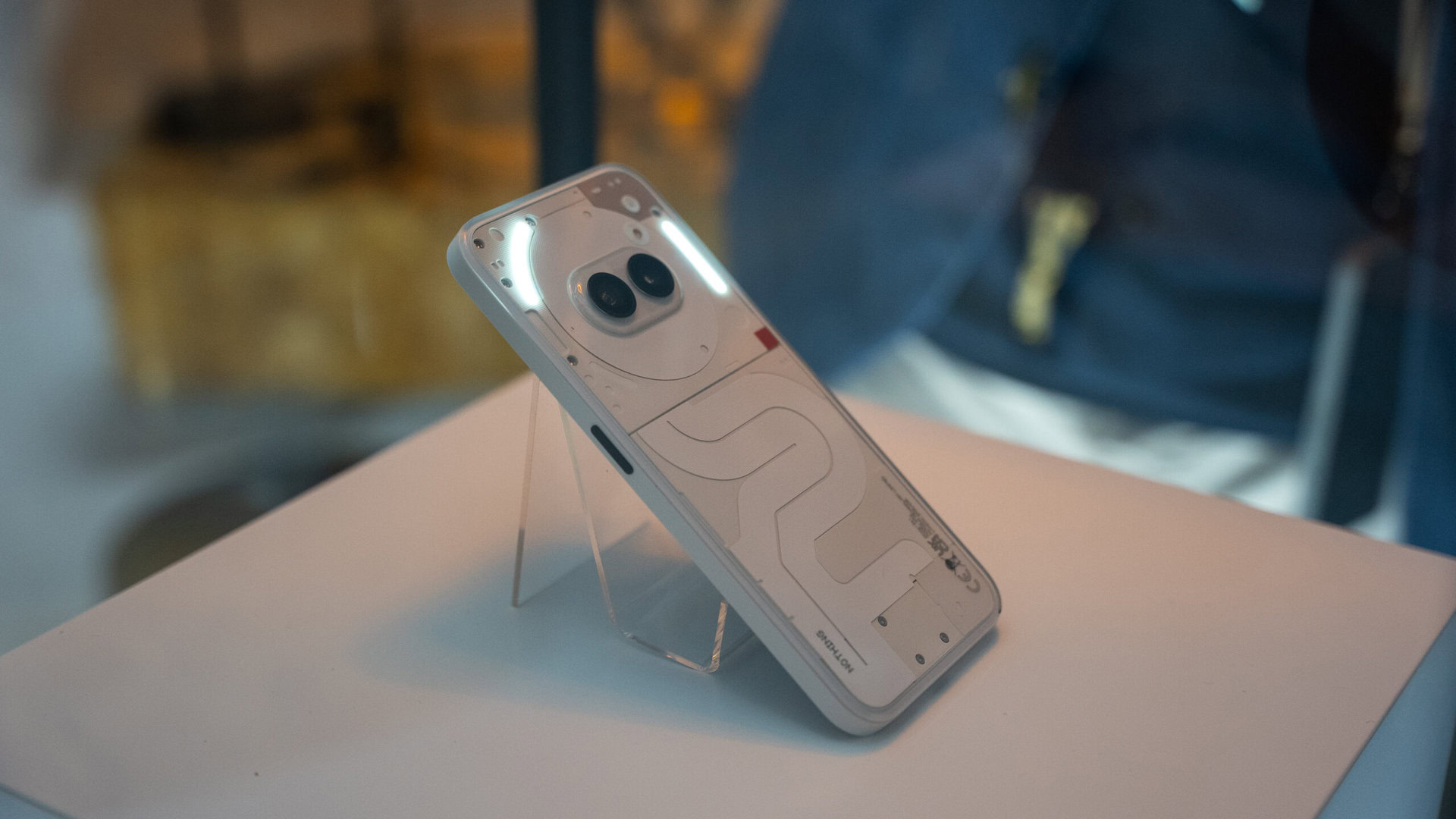 At a Barcelona restaurant packed with journalists, Nothing “unboxed” the Phone 2a by literally pulling apart two large boxes covering a display case with the Phone 2a inside. Because of the way it was propped, we could only see the back of it. However, that’s where a lot of interesting stuff is happening.