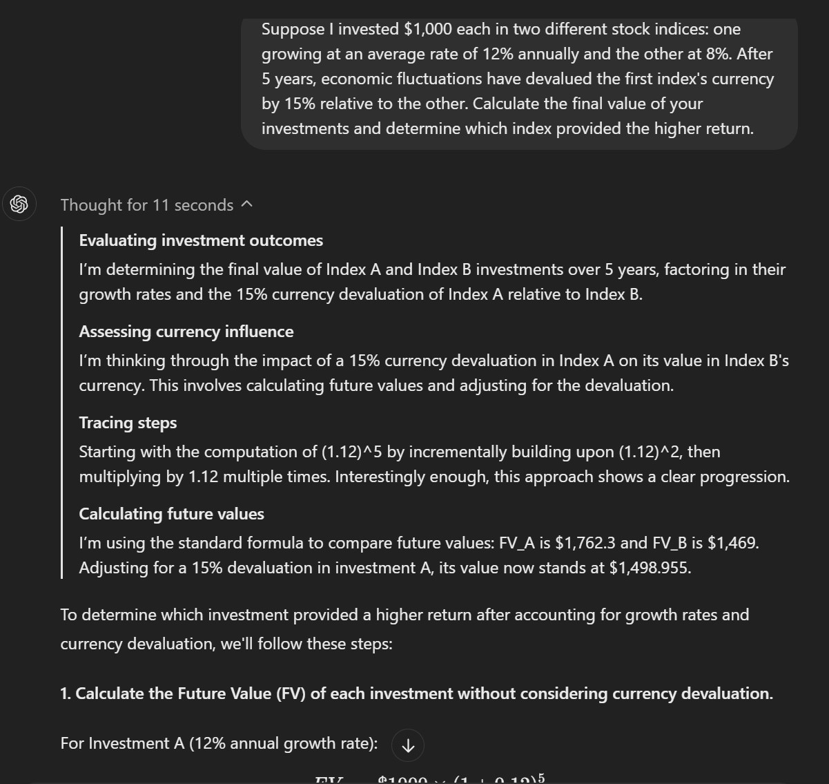 Since simple prompts only require a few seconds of thinking, I decided to take things up a notch. In this prompt, I asked ChatGPT to find the better investment between two assets with differing returns and risks. The chatbot took 11 seconds to think before it responded this time. Once again, it delivered the correct answer while explaining each step.
