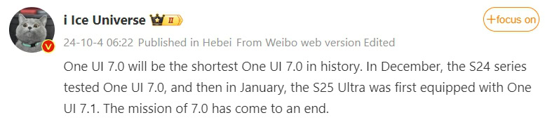 Leaker Ice Universe on Weibo suggests that One UI 7.0 will be the shortest One UI release in Samsung’s mobile OS history.