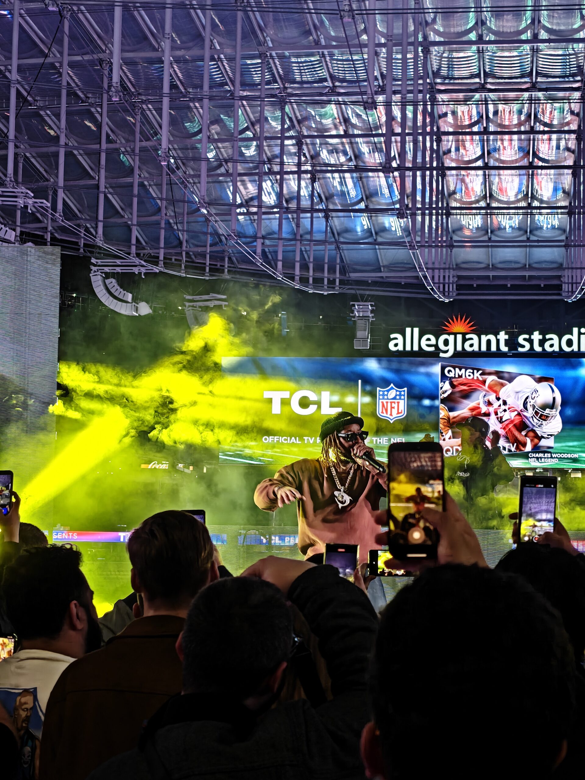 However, the iPhone falls apart somewhat with the noise (high ISO) that I mentioned above. Almost everything in the shot, from the crowd to Lil Jon himself to the rafters of Allegiant Stadium, has a level of fuzziness. It’s not quite bad enough that you can’t tell where one object ends and another begins, but it does give a flatness to the heads in the foreground, the DJ in the background, and the amplifier off to the side of the stage. OnePlus, by contrast, shows a slightly too-smooth Lil Jon and darkened fans in the foreground, which, to my eye, makes Lil Jon pop a bit better.
