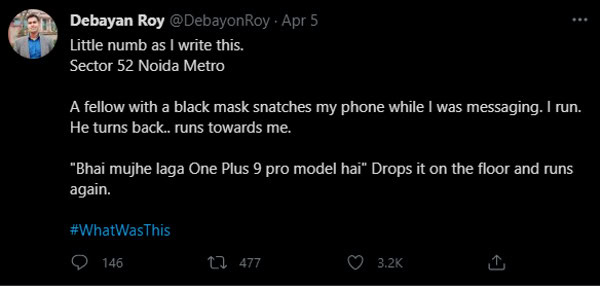 “Bhai mujhe laga OnePlus 9 Pro model hai [Bro, I thought it was a OnePlus 9 Pro],” the thief told the journalist before dropping the phone on the floor and running again.