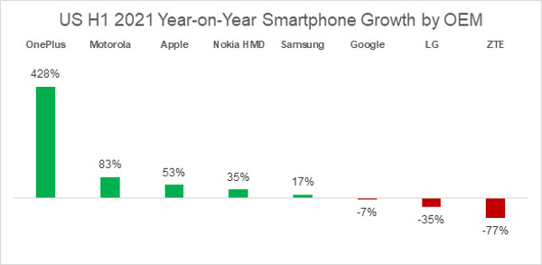 - OnePlus was the fastest-growing OEM in the US in the first half of the year.