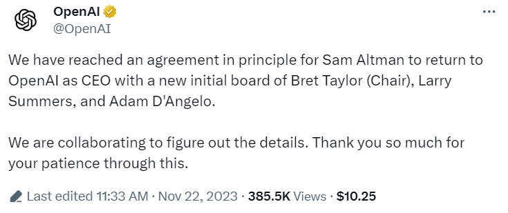 OpenAI announced through its X (formerly known as Twitter) account that it has agreed in principle for its ex-CEO Sam Altman to return as CEO. As part of the arrangement, the composition of its Board of Directors will be changed.
