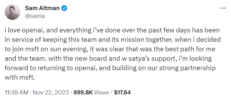 Altman has confirmed the news of his return to OpenAI. Curiously, this is also the first confirmation from his end of him having joined Microsoft.
