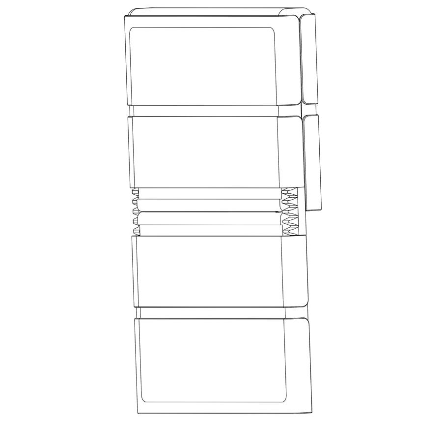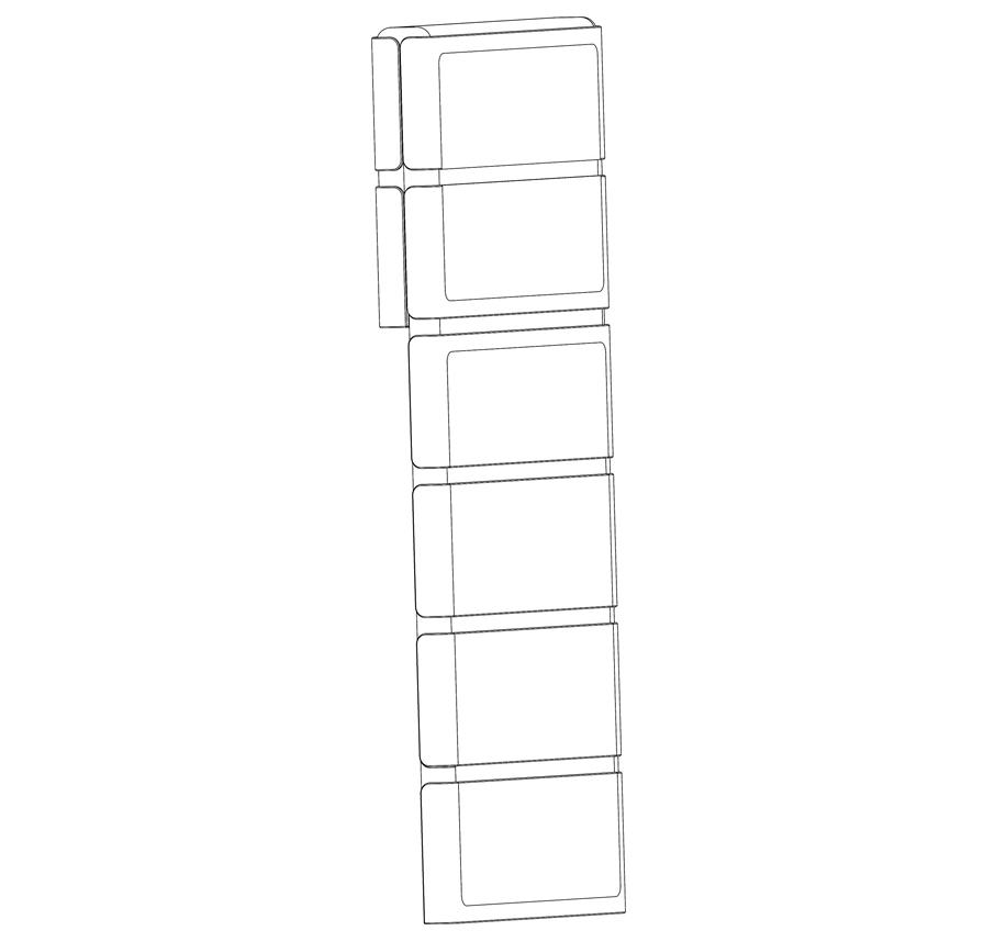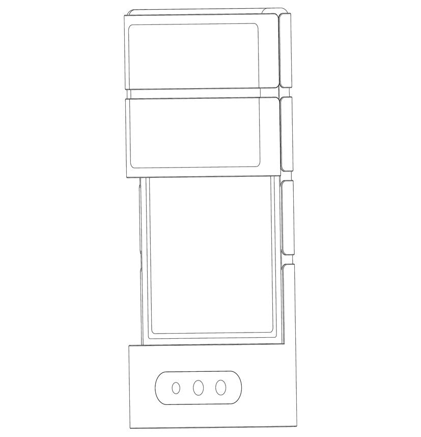 The third patent application shows a taller phone divided into eight blocks instead of six. It can fold inwards into half or partially fold from the top thanks to its two-hinge mechanism.