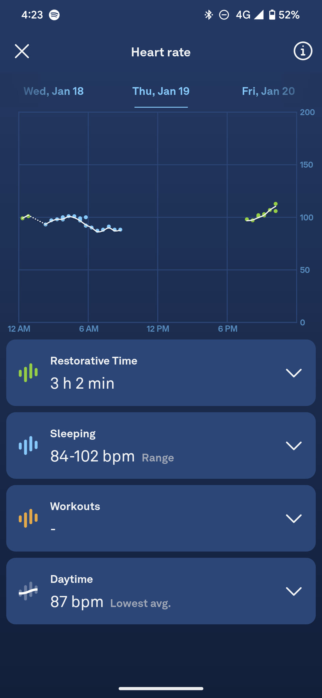 Another drawback is the way heart rate is tracked. I keep noticing some frequent 30-minute gaps in my data and one big gap during a long and strenuous walk on January 19. I thought it could be due to the ring twisting around my finger (i.e. the sensors coming toward the top of my hand), but Oura explained to me that this shouldn’t throw it off.